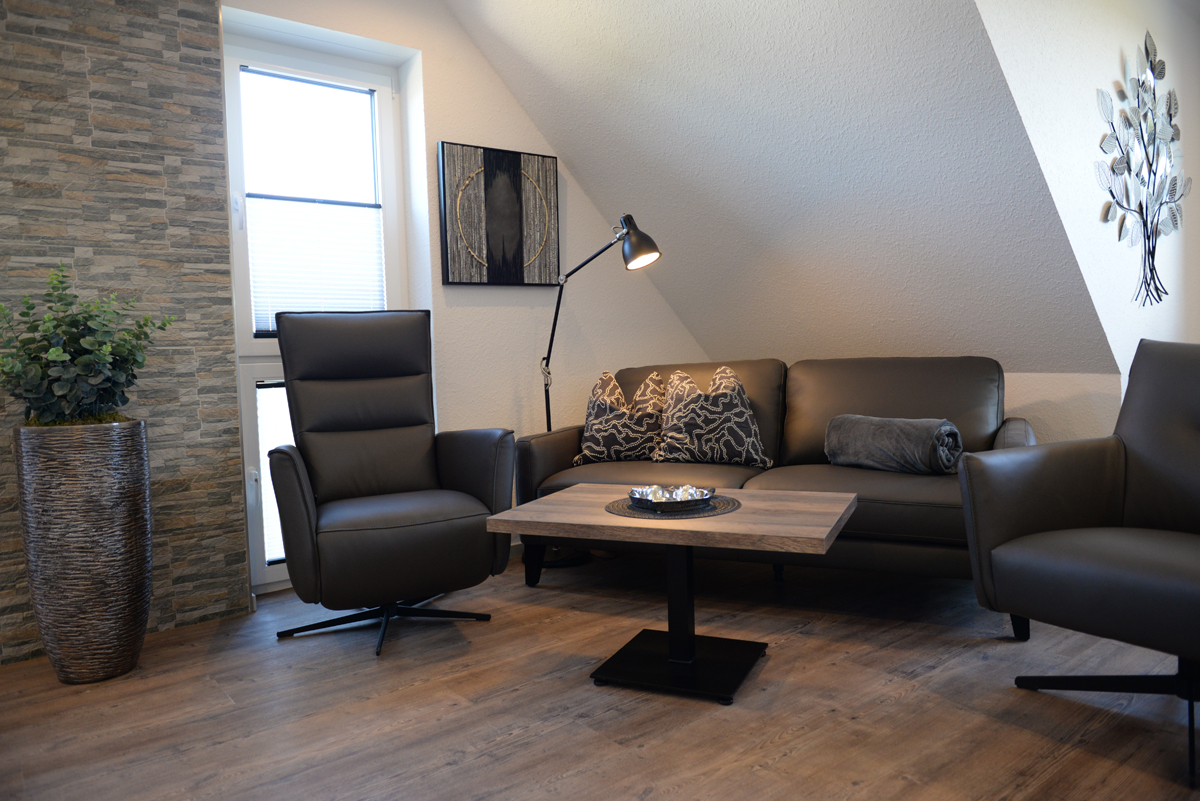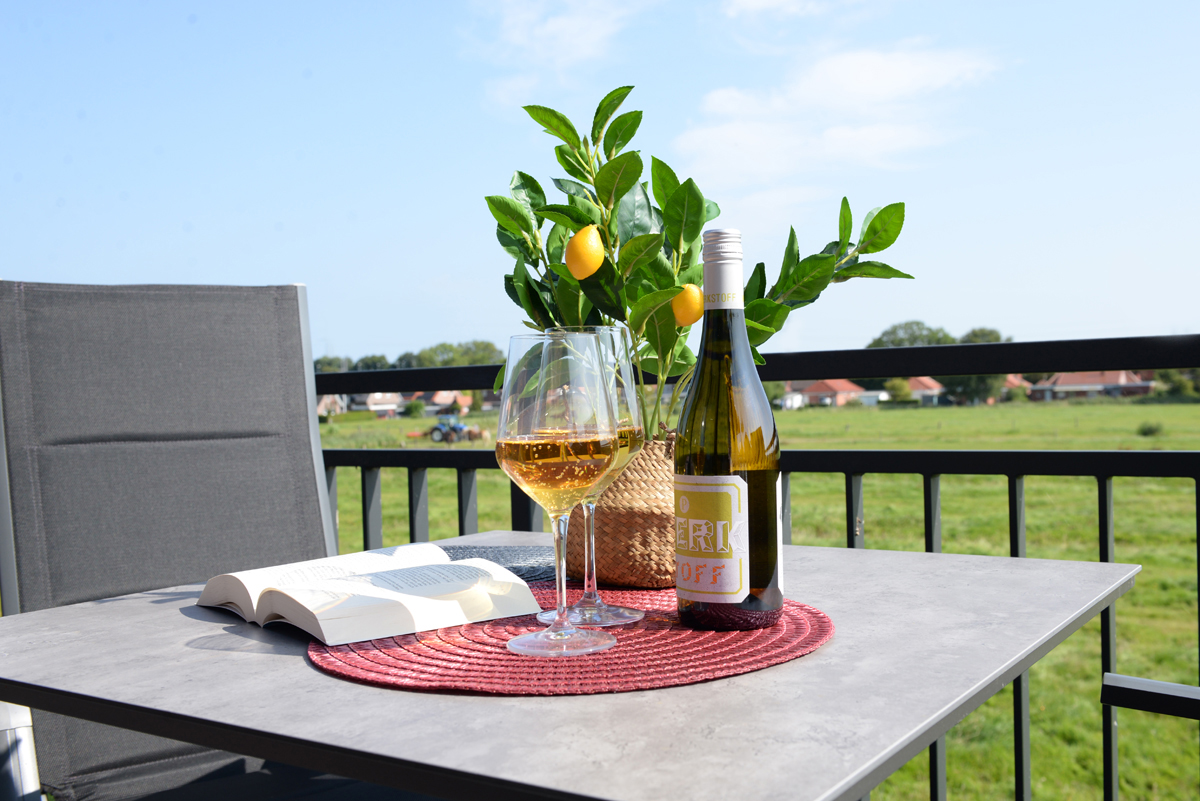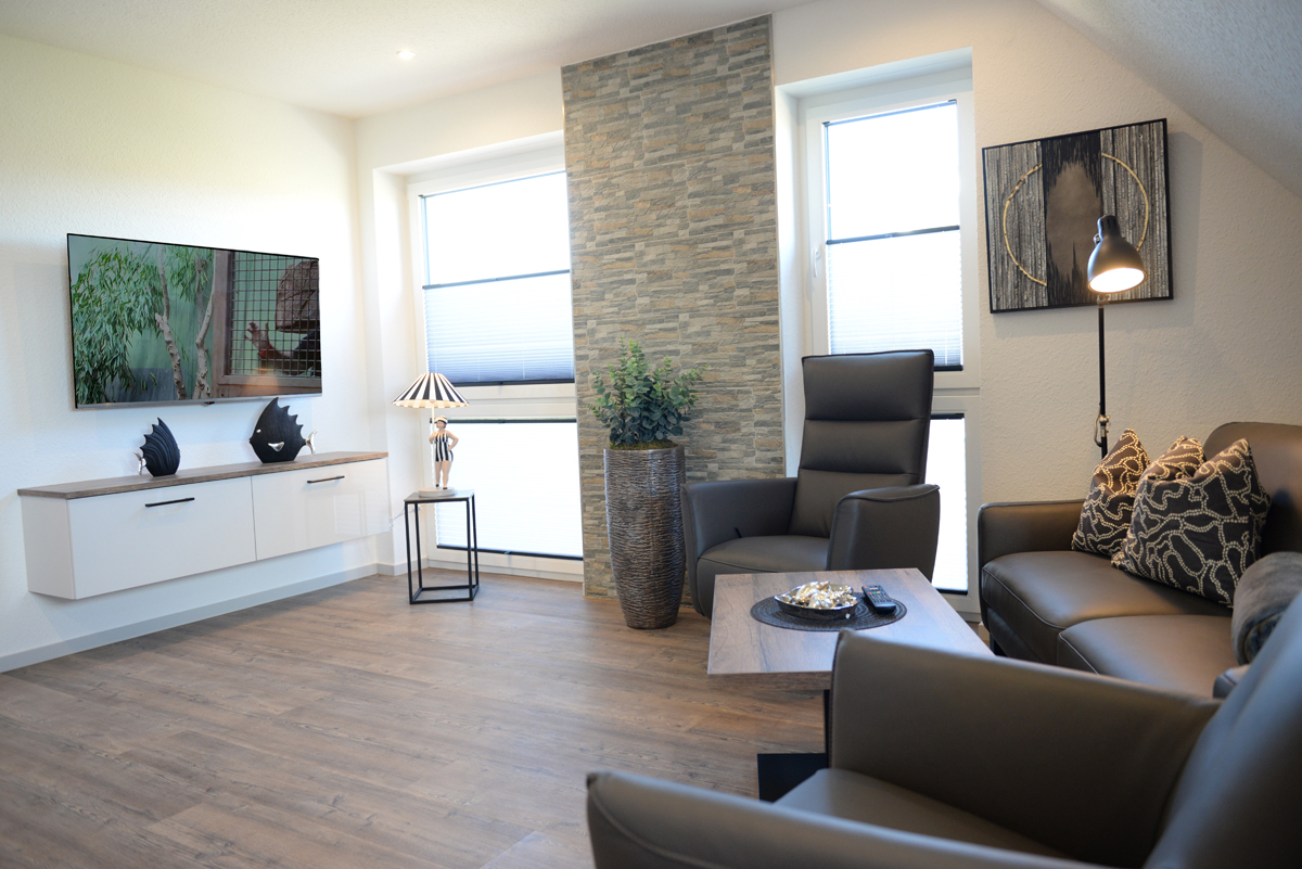 Die Ferienwohnung Deichdeck 3 OL für 2 Personen befindet sich im 1. OG eines neu erbauten Ferienhauses mit insgesamt 4 Ferienwohnungen in Norddeich. Die Wohnung liegt in einer zentralen und sackgassenähnlichen Lage. Das Wohn/Esszimmer ist mit einer gemütlichen Couch u. 2 Sessel, einem Flachbildschirm-Fernseher, einer Essgruppe und einer voll ausgestatteten Einbauküche eingerichtet. Von dort aus gelangen Sie auf einem Balkon, der mit Gartenmöbeln und einem Sonnenschirm ausgestattet ist. Dieses Plätzchen lädt Sie zum Sonnenbaden oder für den späteren Sonnenuntergang am Abend ein.