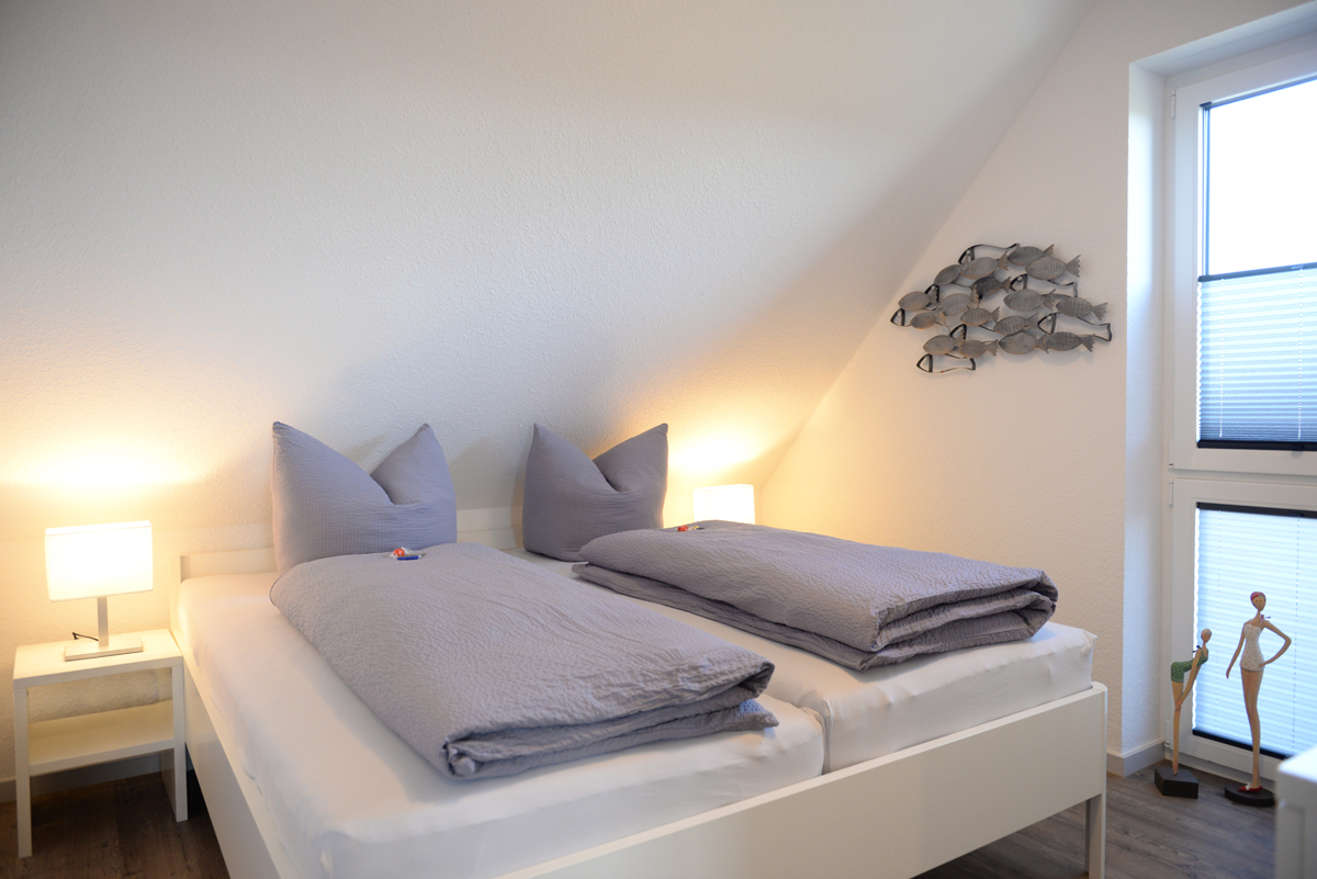 Das Schlafzimmer ist mit einem Doppelbett, Sat/TV, elektrische Außenrolläden + Verdunklungsplissees ausgestattet.