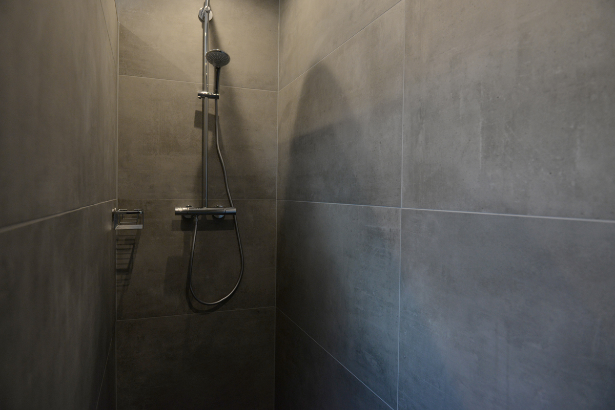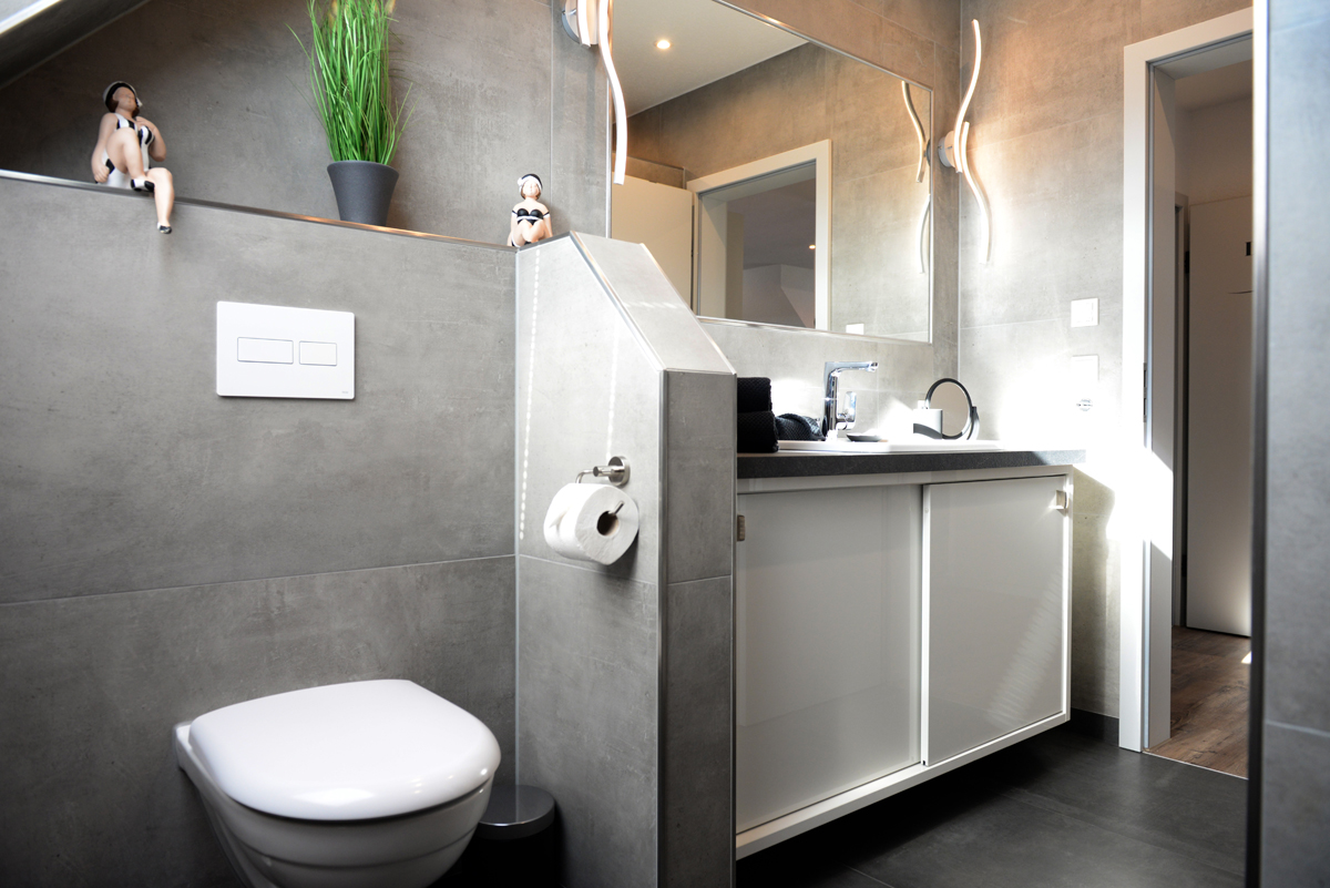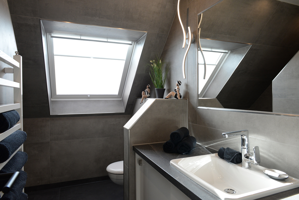 Das moderne Badezimmer mit Veluxfenster verfügt über eine bodenebene Dusche, einem WC, eine Waschtischkombination mit großem Spiegel,Föhn usw.