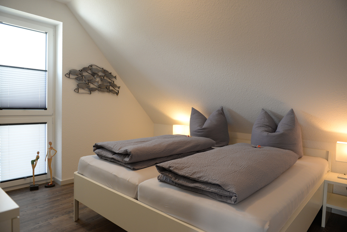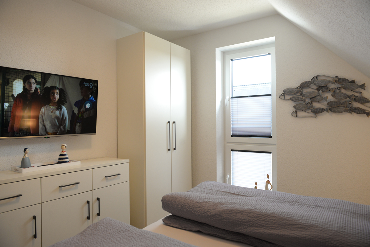 Das Schlafzimmer ist mit einem Doppelbett, Sat/TV, elektrische Außenrolläden + Verdunklungsplissees ausgestattet.