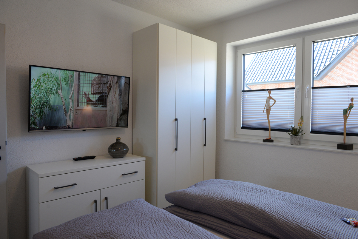Das Schlafzimmer ist mit einem Doppelbett, Sat/TV, elektrische Außenrolläden + Verdunklungsplissees ausgestattet.