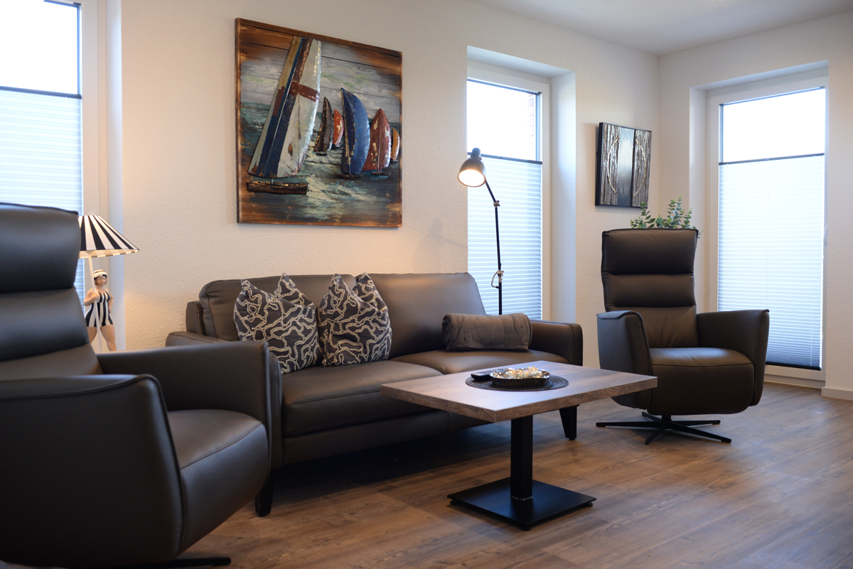 Die Ferienwohnung Deichdeck 3 UL für 2 Personen befindet sich im Erdgeschoss eines neu erbauten Ferienhauses mit insgesamt 4 Ferienwohnungen in Norddeich. Die Wohnung liegt in einer zentralen und sackgassenähnlichen Lage . Das Wohn/Esszimmer ist mit einer gemütlichen Couch u. 2 Relaxsessel, einem Flachbildschirm-Fernseher, einer Essgruppe und einer voll ausgestatteten Einbauküche eingerichtet. Von dort aus gelangen Sie auf eine teilweise überdachte Terrasse, die mit Gartenmöbeln und Sonnenschirm ausgestattet ist. Dieses Plätzchen lädt sie zum Sonnenbaden oder für den späteren Sonnenuntergang am Abend ein.
