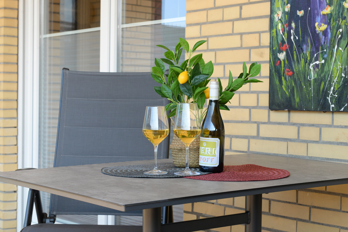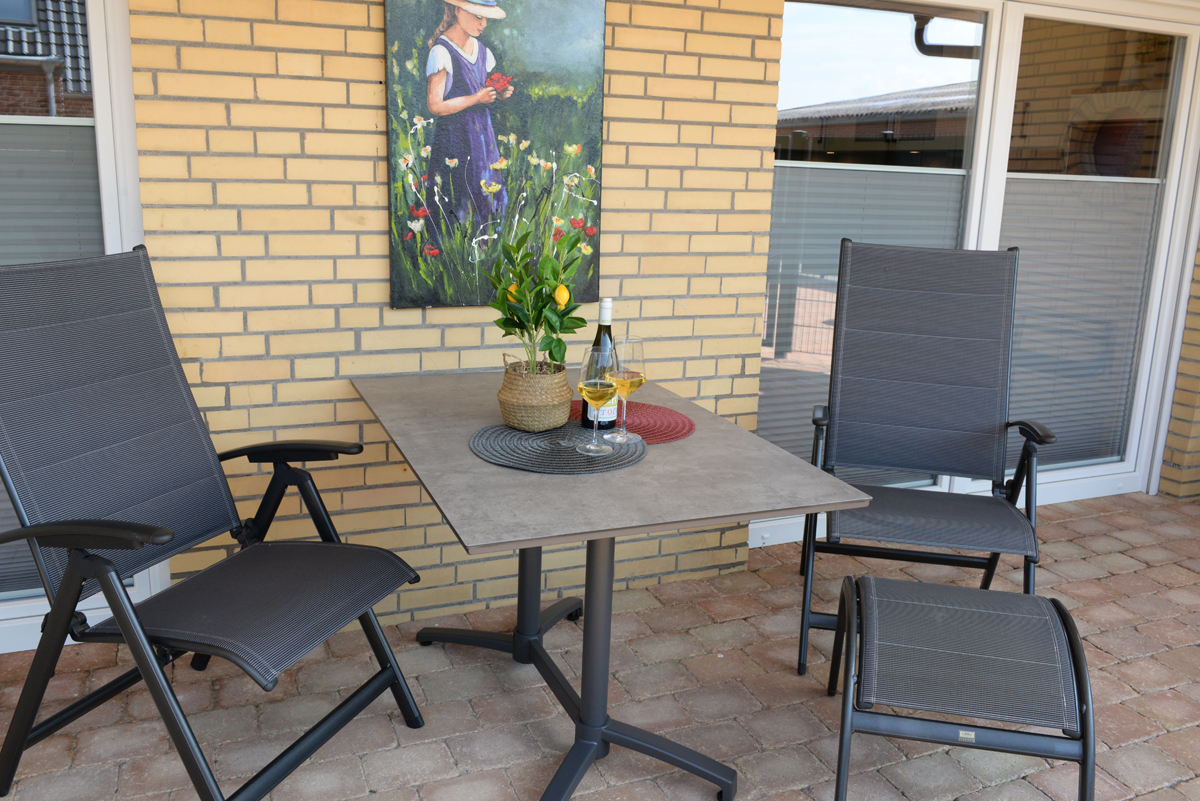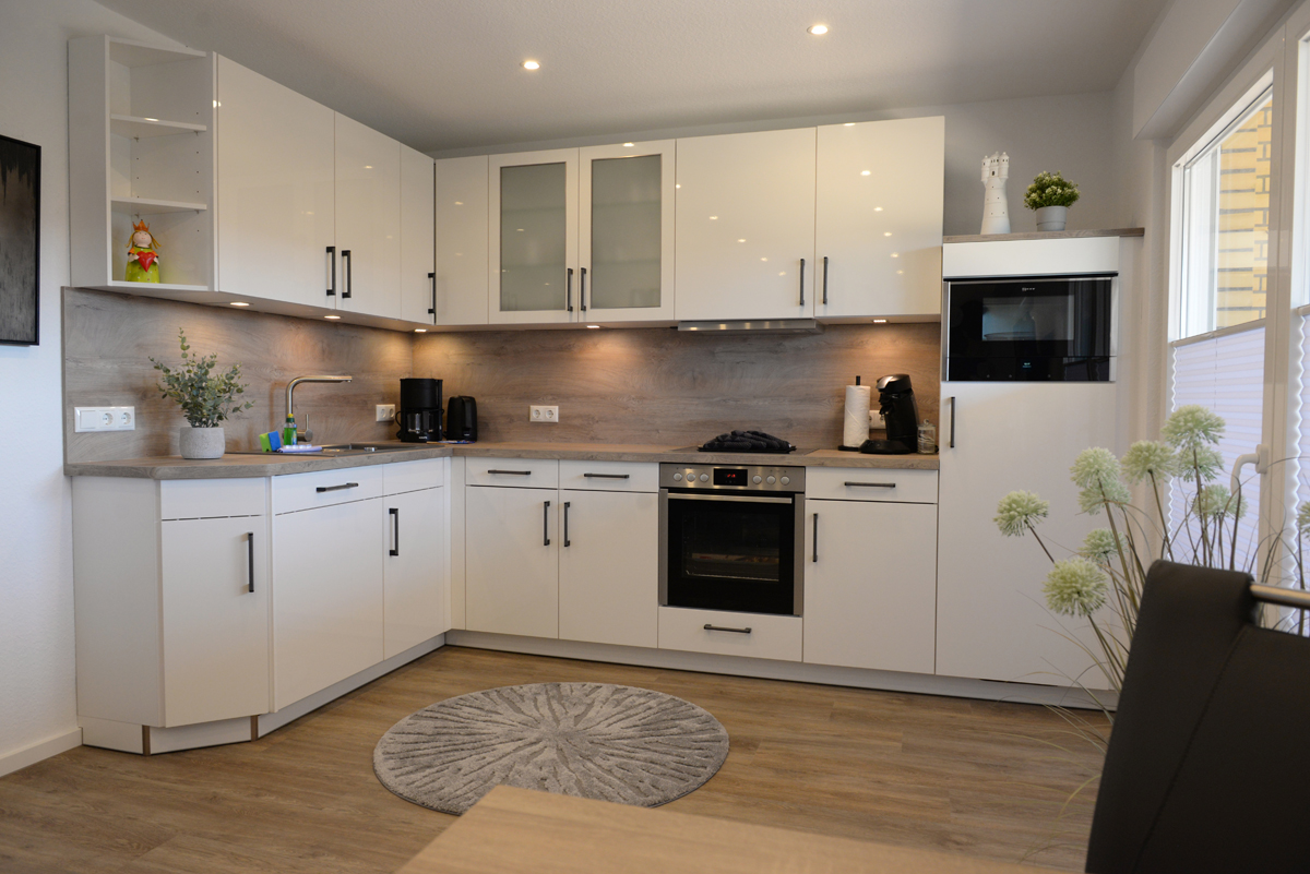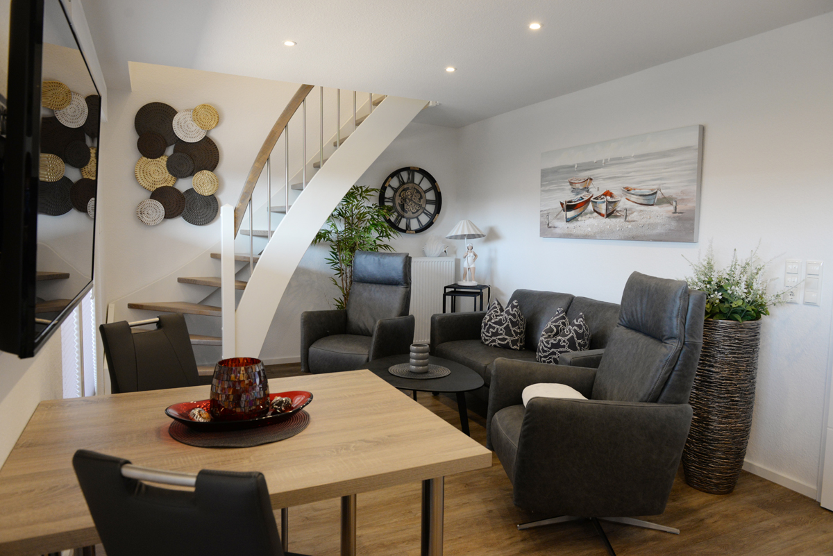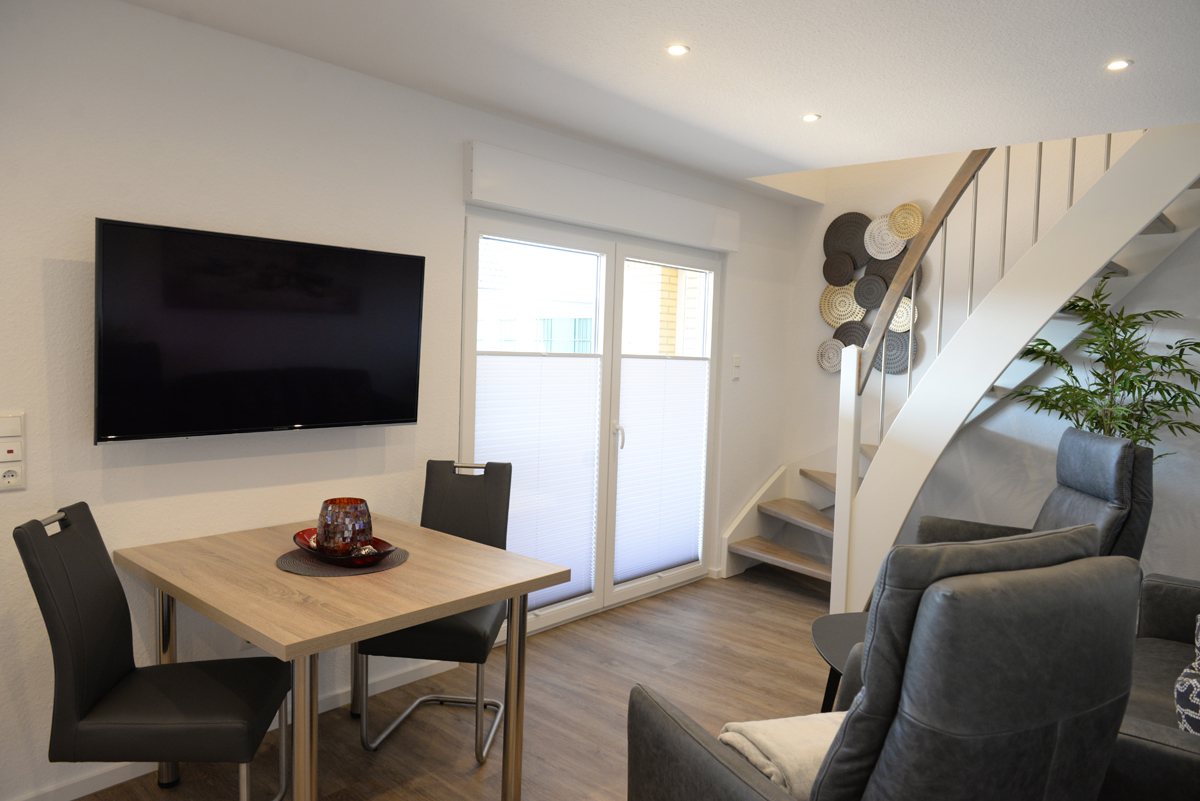 Im Wohn - Essbereich ist eine integriete - voll ausgestattete Küche, eine Essgruppe, ein Flachbildschirm Sat/TV, eine gemütliche Couch mit 2 Relaxsessel ist vorhanden. Von dort aus gelangen Sie auf die möblierte Terrasse - die zum Sonnenbaden und Relaxen einlädt..