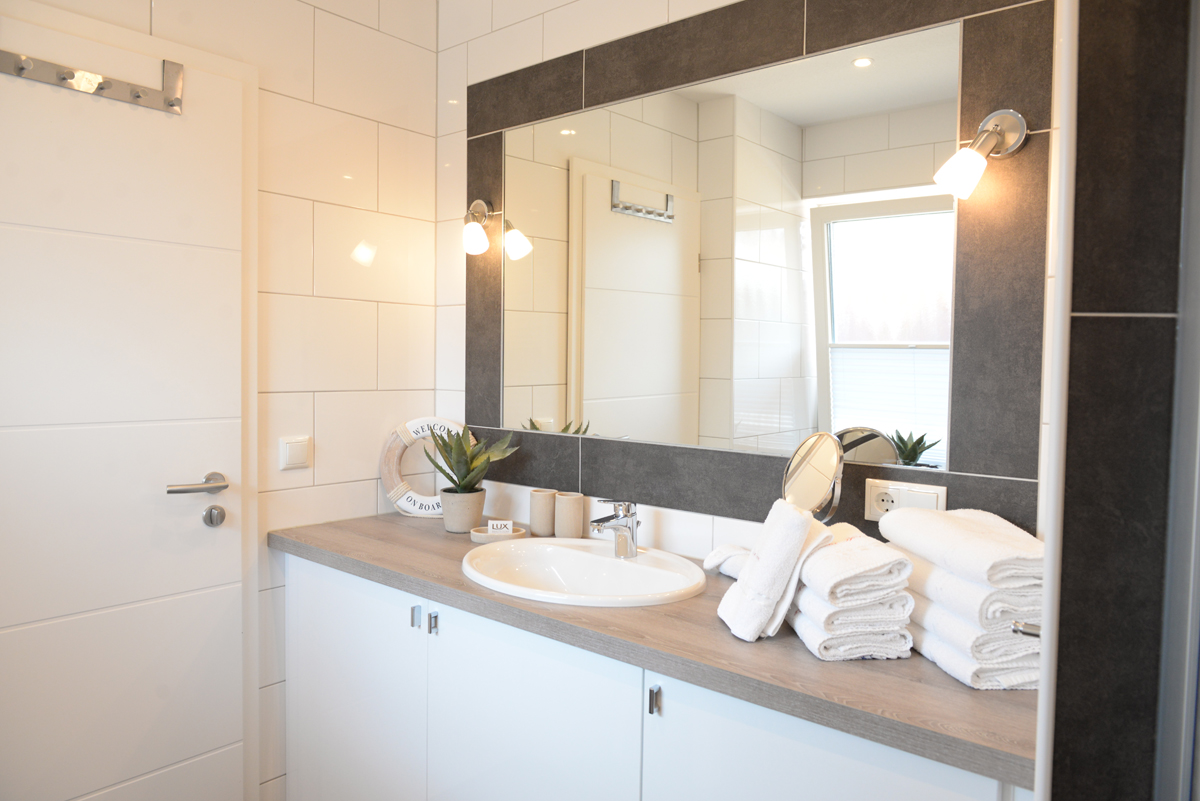 Das moderene großzügige Bad/WC hat eine bodenebene Dusche, ein Fenster und eine Waschtischanlage mit großen Spiegel.