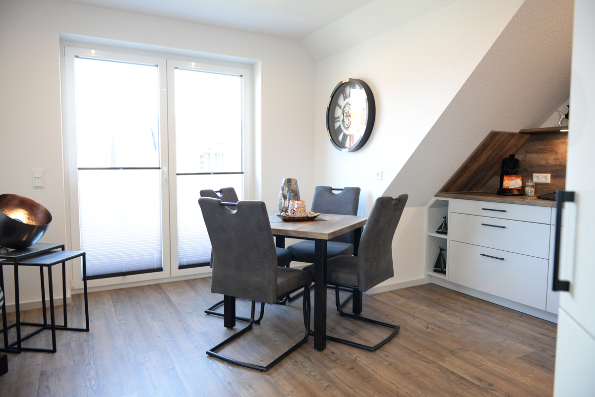 Die Ferienwohnung Deichdeck 1 OL für 2 Personen befindet sich im 1. OG eines neu erbauten Ferienhauses mit insgesamt 4 Ferienwohnungen in Norddeich. Die Wohnung liegt in einer zentralen und sackgassenähnlichen Lage. Das Wohn/Esszimmer ist mit einer gemütlichen Couch u. 2 Sessel, einem Flachbildschirm-Fernseher, einer Essgruppe und einer voll ausgestatteten Einbauküche eingerichtet. Von dort aus gelangen Sie auf einem Balkon, der mit Gartenmöbeln und einem Sonnenschirm ausgestattet ist. Dieses Plätzchen lädt Sie zum Sonnenbaden oder für den späteren Sonnenuntergang am Abend ein.