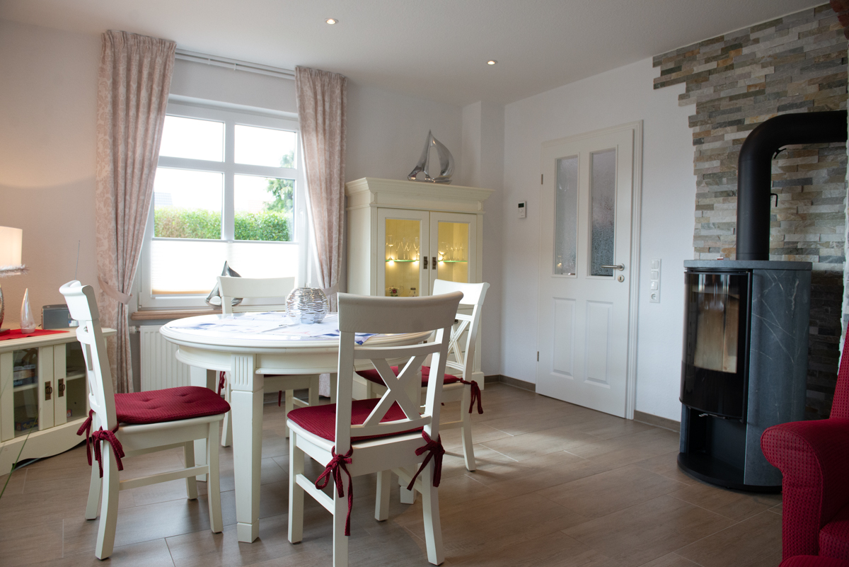 Das Ferienhaus Meta zum Alleinbewohnen besticht durch ein wunderschönes Wohn - Esszimmer mit einer gemütlichen Garnitur, Essgruppe und einem Kamin der an kalten Tagen für wohlige Wärme sorgt.