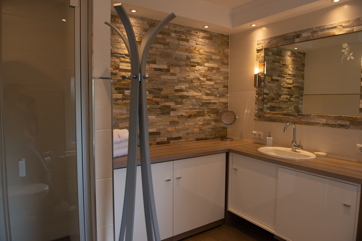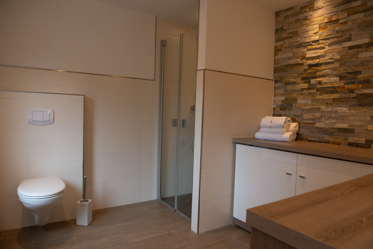 Das großzügige Bad mit WC, einer Waschmaschine und einer bodenebener Dusche ist ebenfalls im EG vorhanden.