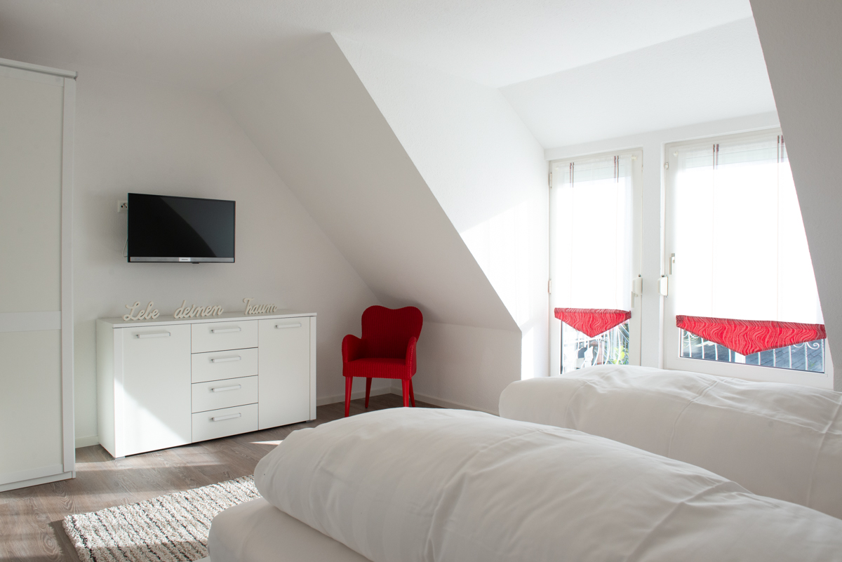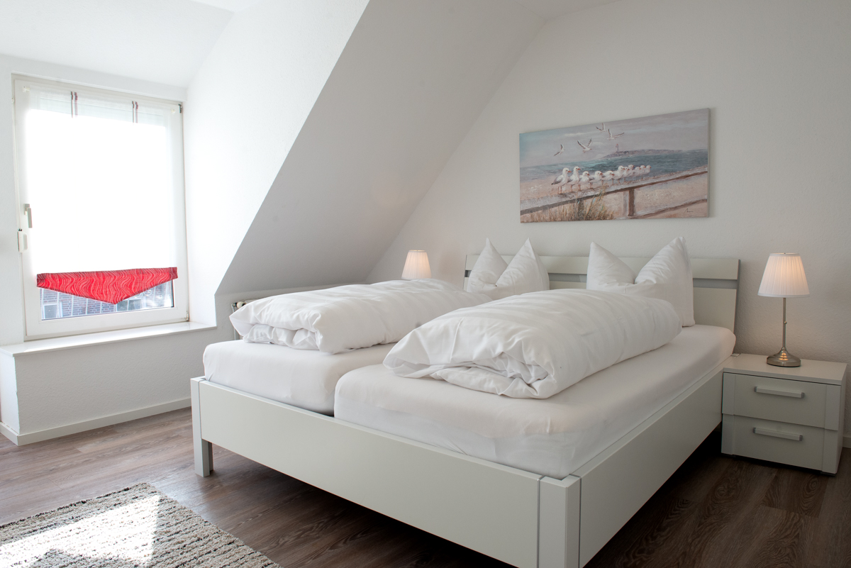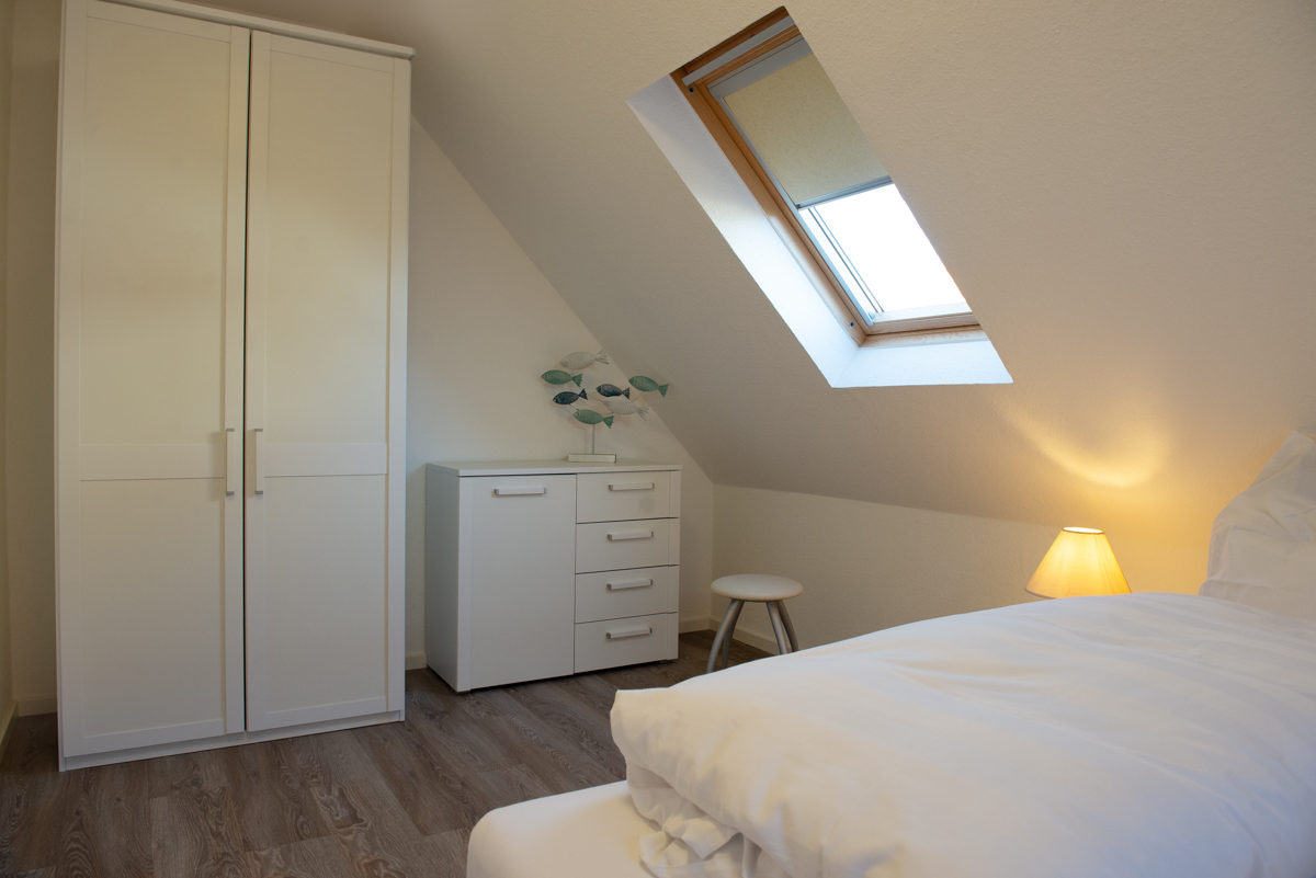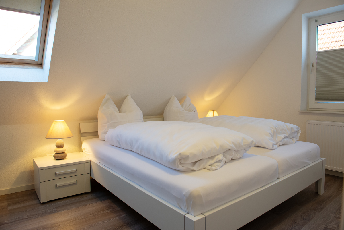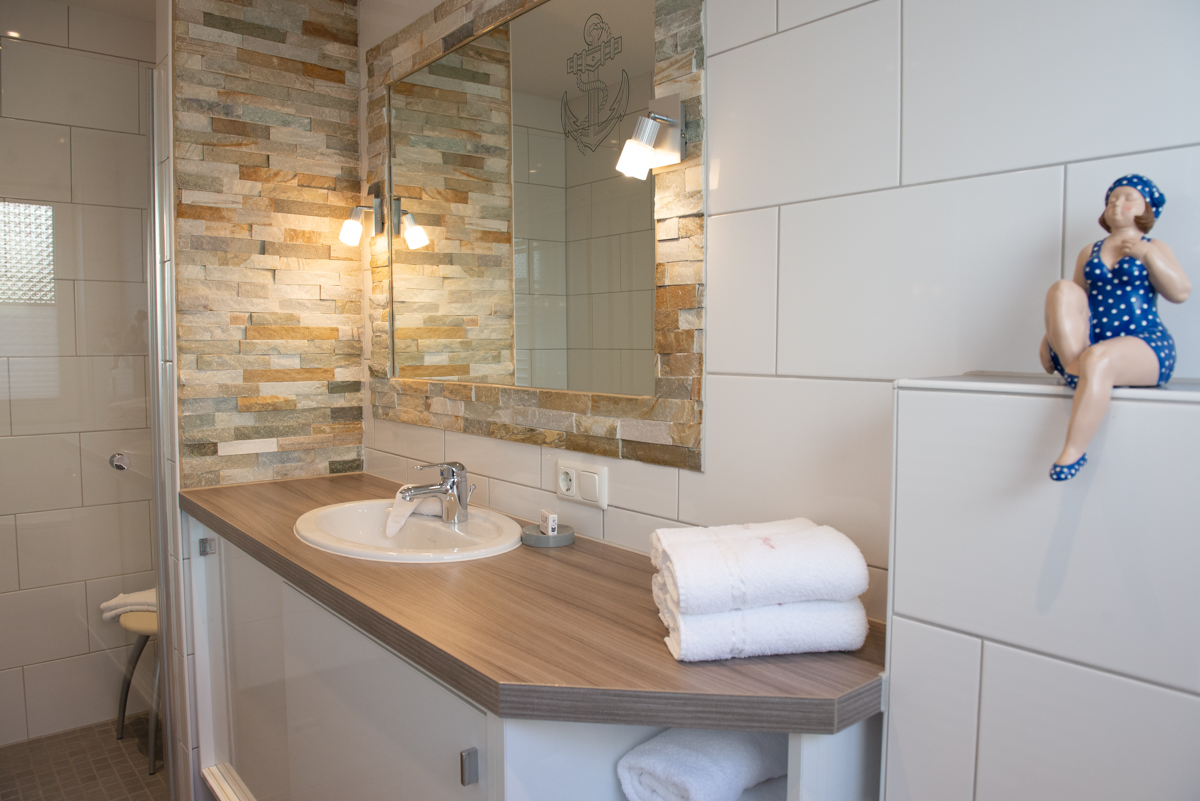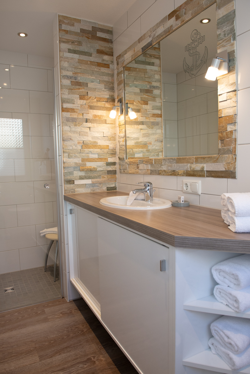Die Ferienwohnung Backbord verfügt über zwei getrennte Schlafzimmer im 1. OG ,davon ist ein Schlafzimmer mit Außenrolläden und SAT- TV ausgestattet .Außerdem befindet sich im 1. OG ein zusätzliches WC. Das moderne Bad / WC ist mit Fenster, einer bodenebenen Dusche und einem Handtuchhalter - Heizkörper ausgestattet.