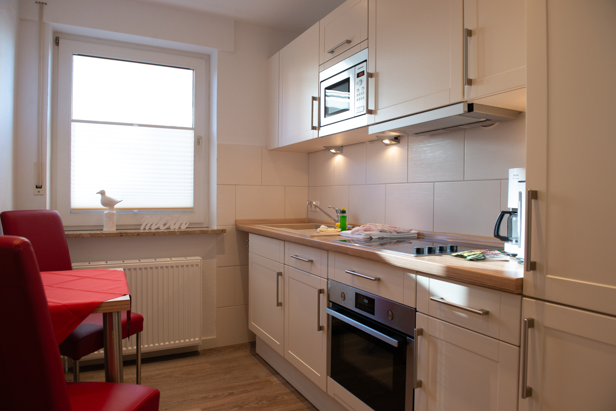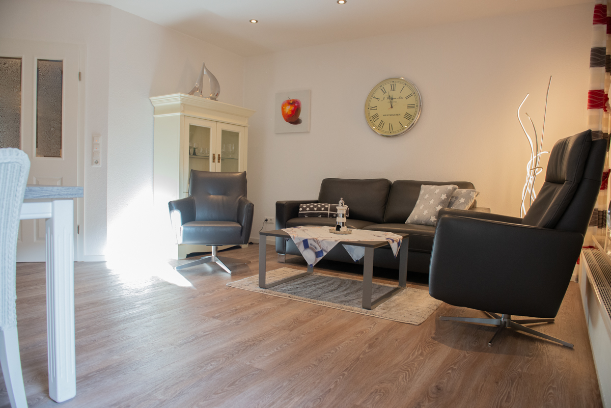 Im Wohn - Essbereich mit Tisch und 4 Stühlen sowie einer gemütlichen Couch, einem Sessel / Relax-Sessel und Sat-TV mit Flachbildschirm können Sie entspannt relaxen, Essen oder z.B. mit der Familie oder Freunden einen Spieleabend gestalten. Die getrennte, compl. eingerichtete Küche liegt ebenfalls im unteren Teil der Wohnung.