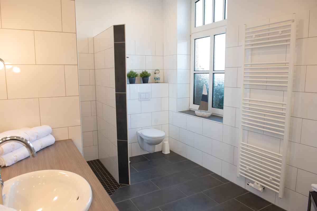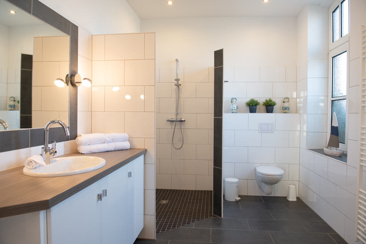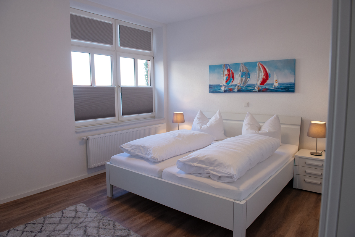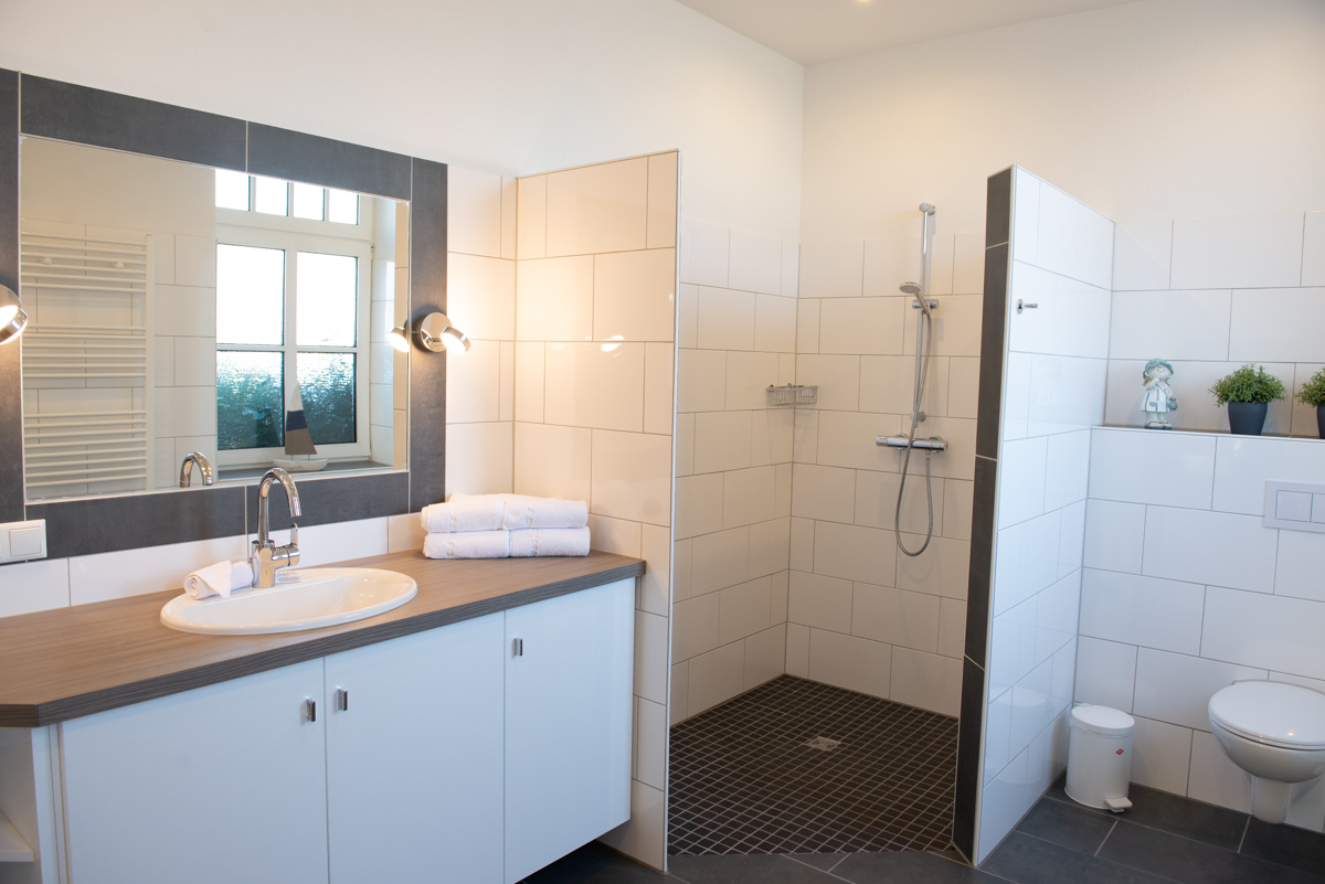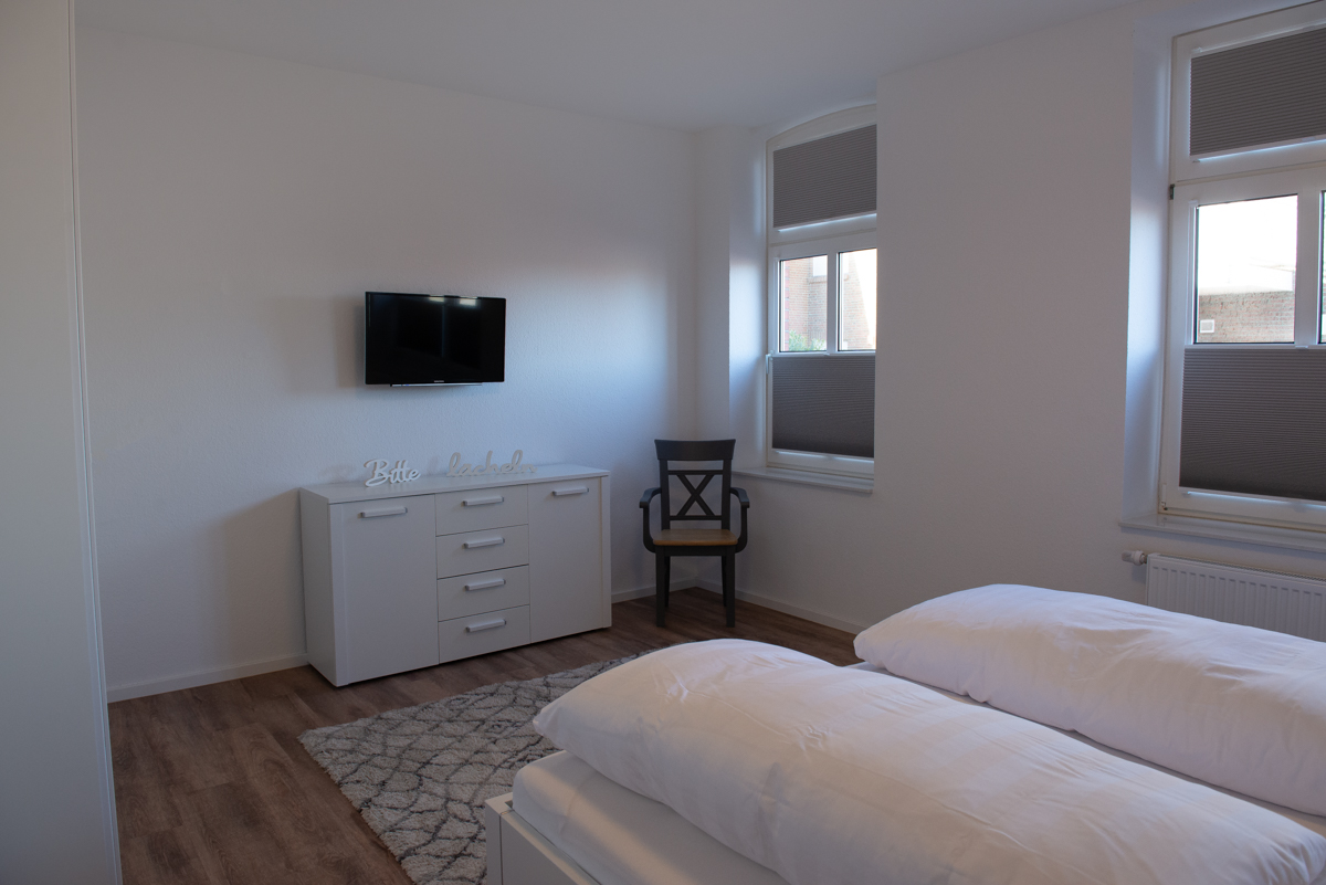 Die Erdgeschosswohnung Brügg verfügt über zwei getrennte Schlafzimmer mit Verdunklungsplisees. Davon ist ein Schlafzimmer mit Flach/TV ausgestattet. Das moderne Bad / WC ist mit Fenster, einer bodenebenen Dusche und einem Handtuchhalter- Heizkörper ausgestattet.