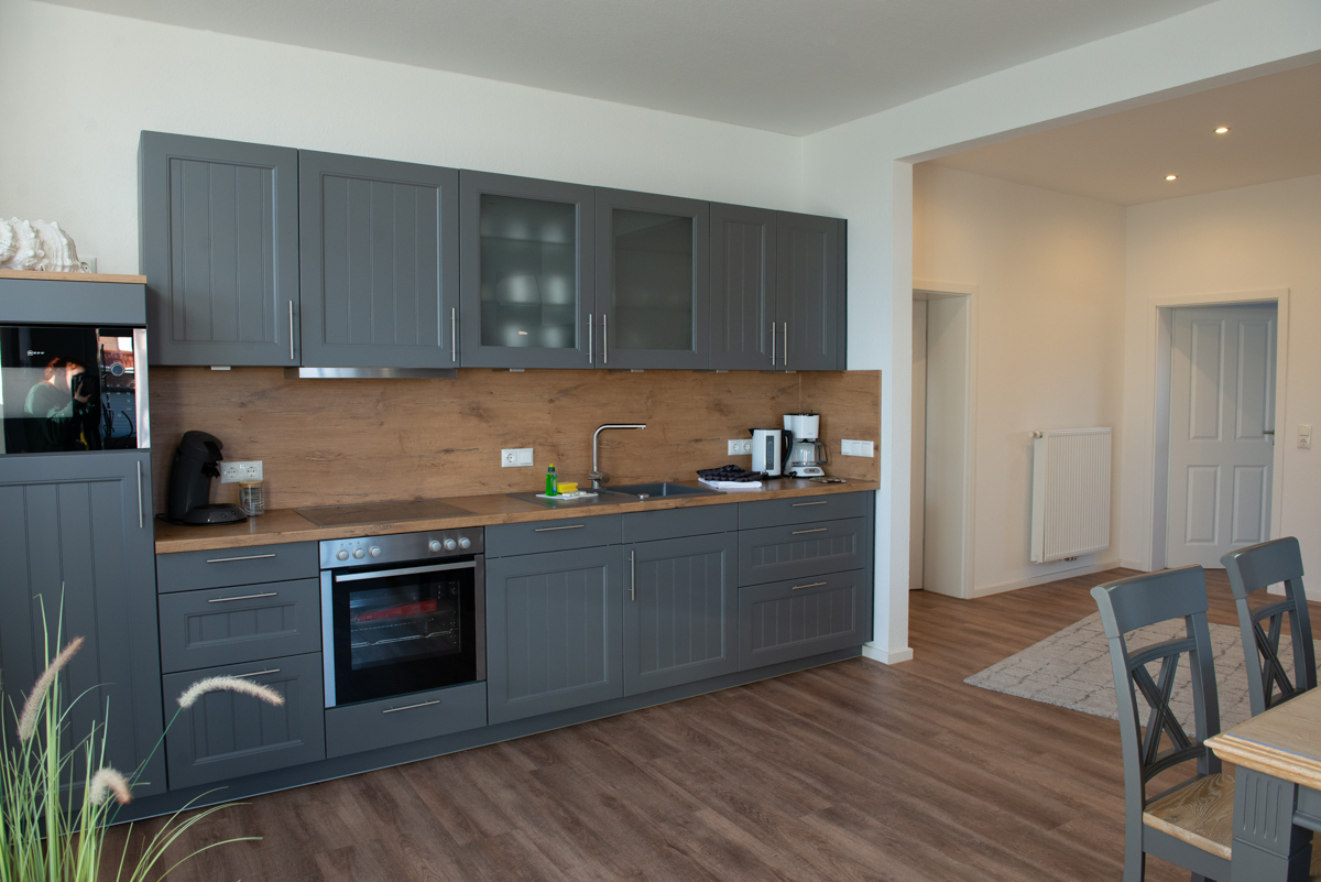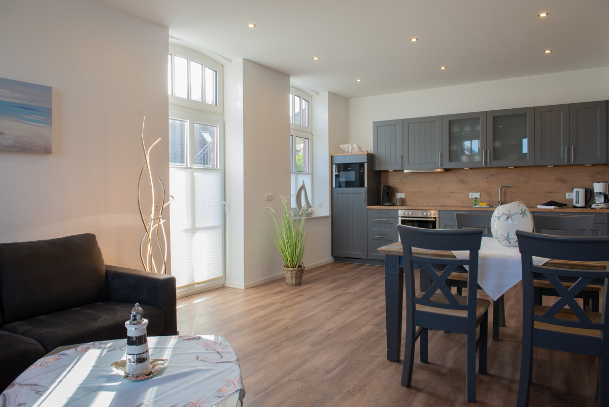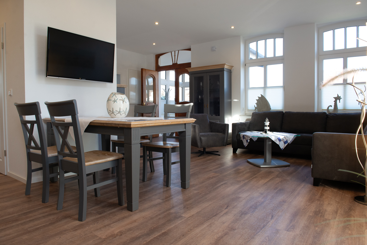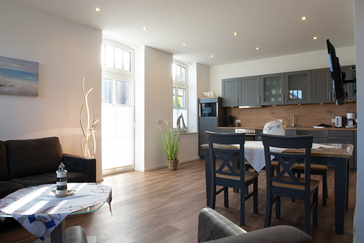 Im Wohn - Essbereich mit integrieter vollausgestatteter Einbauküche, Tisch und 4 Stühlen sowie einer gemütlichen Couch, einem Sessel und Sat-TV mit Flachbildschirm können Sie entspannt relaxen, Essen oder z. B. mit der Familie oder Freunden einen Spieleabend gestalten.