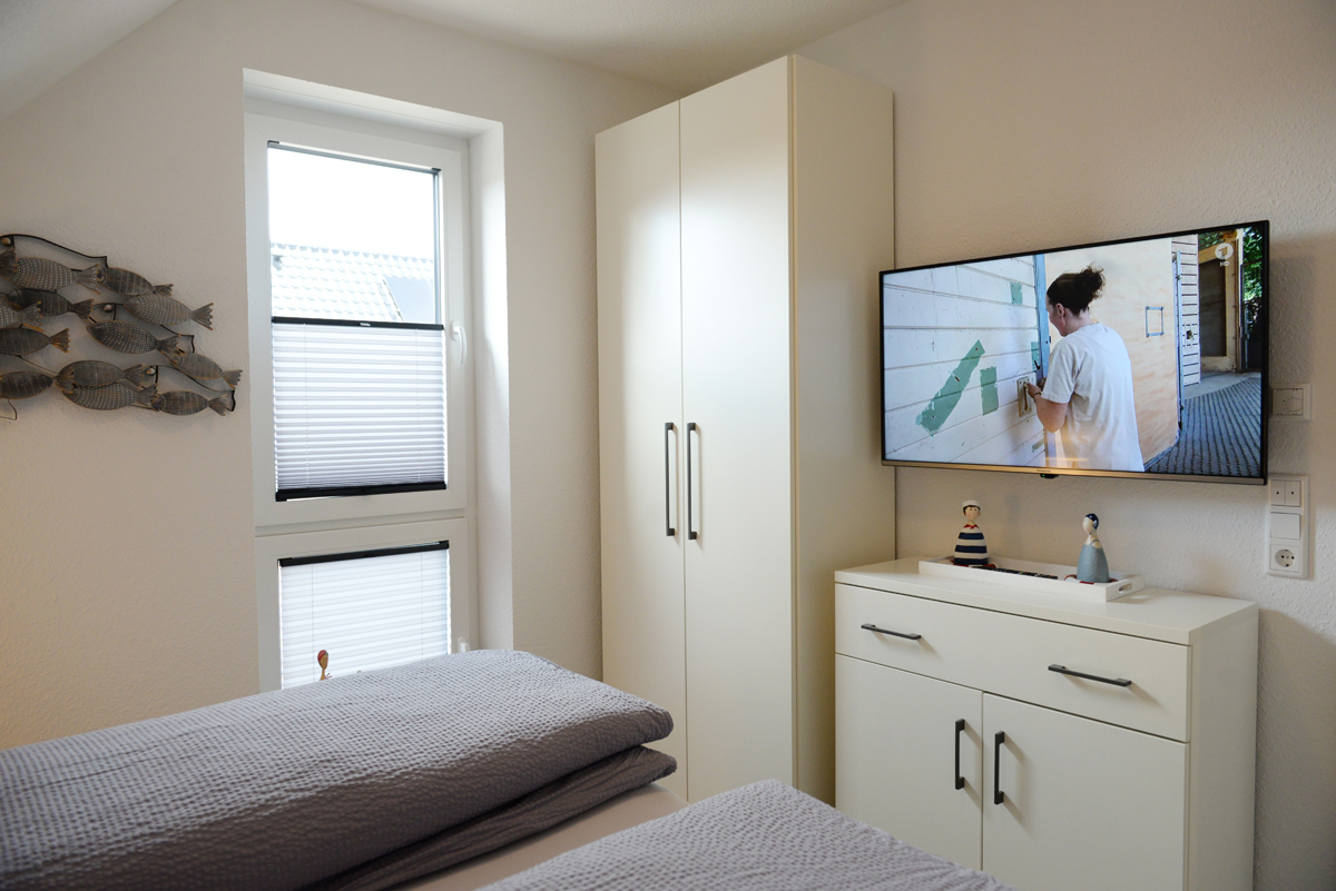 Das Schlafzimmer ist mit einem Doppelbett, Sat/TV, elektrische Außenrolläden + Verdunklungsplissees ausgestattet.