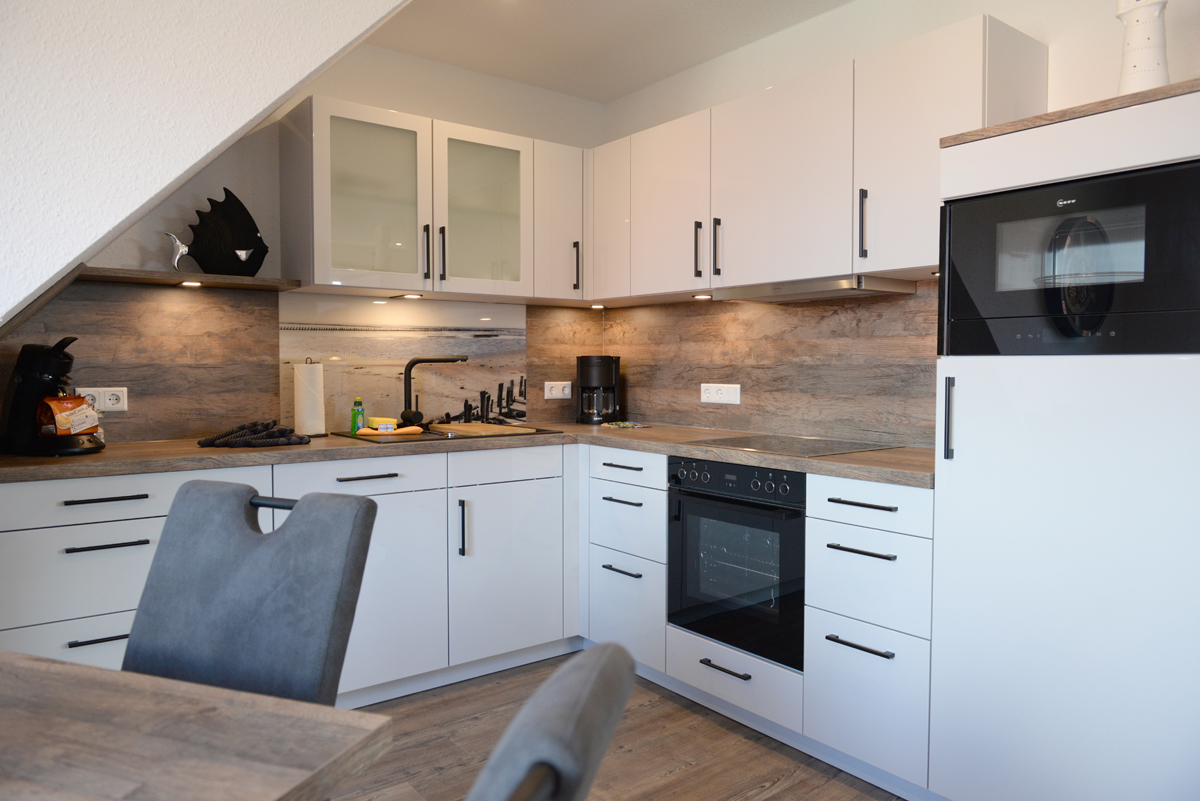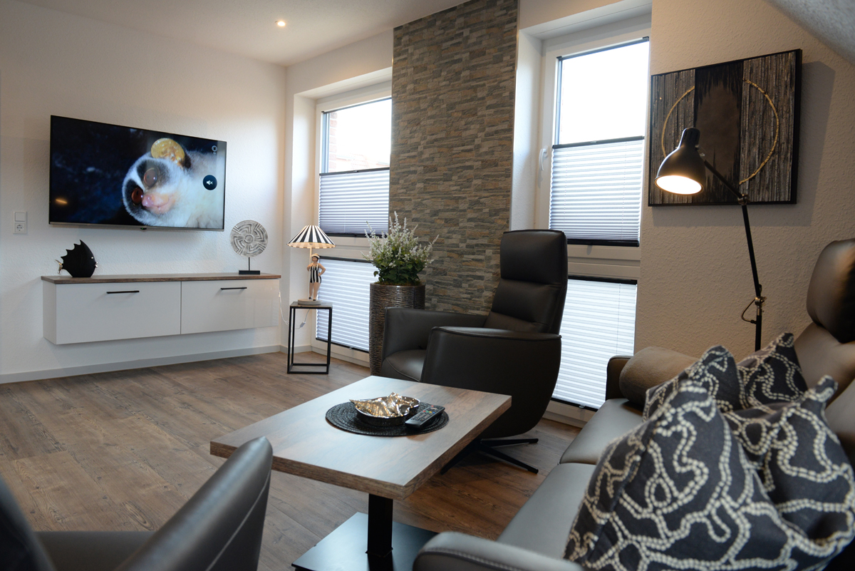 Die Ferienwohnung Deichdeck 1 OL für 2 Personen befindet sich im 1. OG eines neu erbauten Ferienhauses mit insgesamt 4 Ferienwohnungen in Norddeich. Die Wohnung liegt in einer zentralen und sackgassenähnlichen Lage. Das Wohn/Esszimmer ist mit einer gemütlichen Couch u. 2 Sessel, einem Flachbildschirm-Fernseher, einer Essgruppe und einer voll ausgestatteten Einbauküche eingerichtet. Von dort aus gelangen Sie auf einem Balkon, der mit Gartenmöbeln und einem Sonnenschirm ausgestattet ist. Dieses Plätzchen lädt Sie zum Sonnenbaden oder für den späteren Sonnenuntergang am Abend ein.