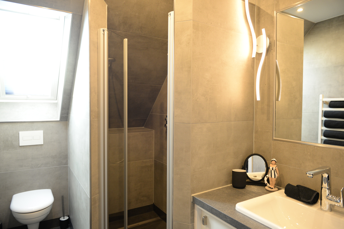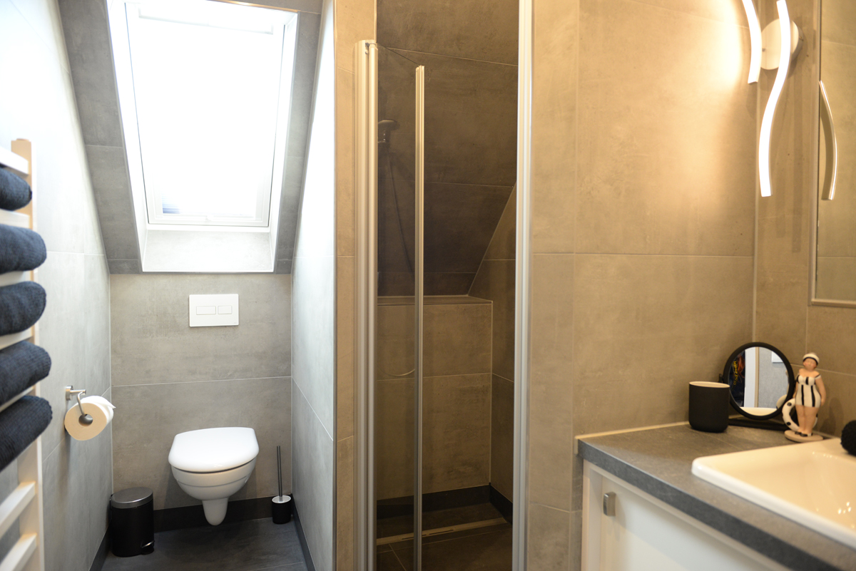 Das moderne Badezimmer mit Veluxfenster verfügt über eine bodenebene Dusche, einem WC, eine Waschtischkombination mit großem Spiegel,Föhn usw.