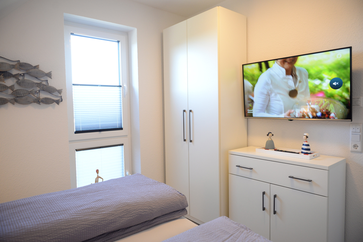 Das Schlafzimmer ist mit einem Doppelbett, Sat/TV, elektrische Außenrolläden + Verdunklungsplissees ausgestattet.
