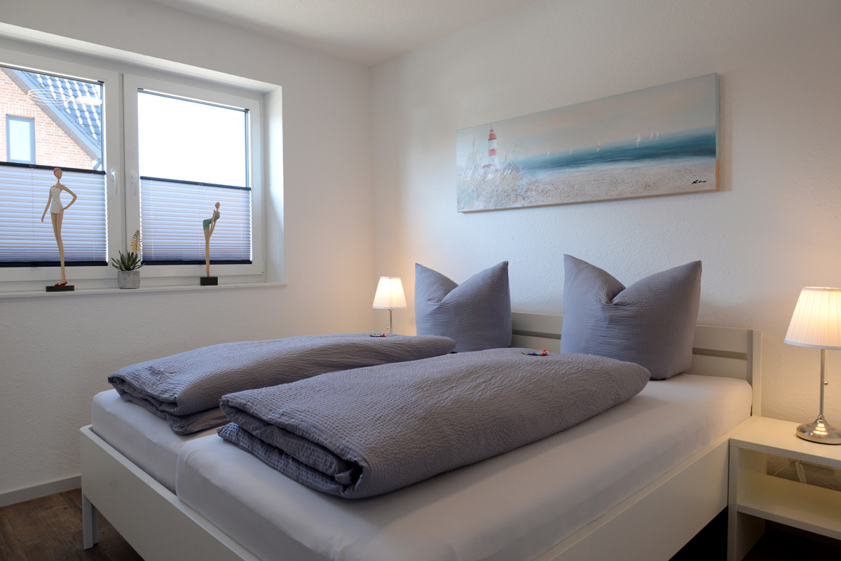 Das Schlafzimmer ist mit einem Doppelbett, Sat/TV, elektrische Außenrolläden + Verdunklungsplissees ausgestattet.