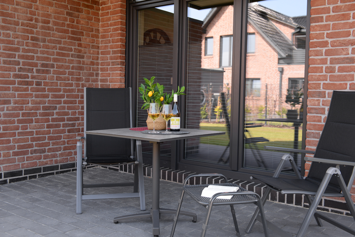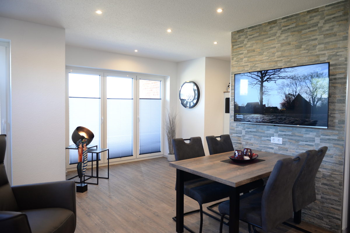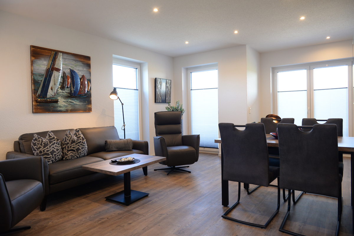 Die Ferienwohnung Deichdeck 3 UL für 2 Personen befindet sich im Erdgeschoss eines neu erbauten Ferienhauses mit insgesamt 4 Ferienwohnungen in Norddeich. Die Wohnung liegt in einer zentralen und sackgassenähnlichen Lage . Das Wohn/Esszimmer ist mit einer gemütlichen Couch u. 2 Relaxsessel, einem Flachbildschirm-Fernseher, einer Essgruppe und einer voll ausgestatteten Einbauküche eingerichtet. Von dort aus gelangen Sie auf eine teilweise überdachte Terrasse, die mit Gartenmöbeln und Sonnenschirm ausgestattet ist. Dieses Plätzchen lädt sie zum Sonnenbaden oder für den späteren Sonnenuntergang am Abend ein.