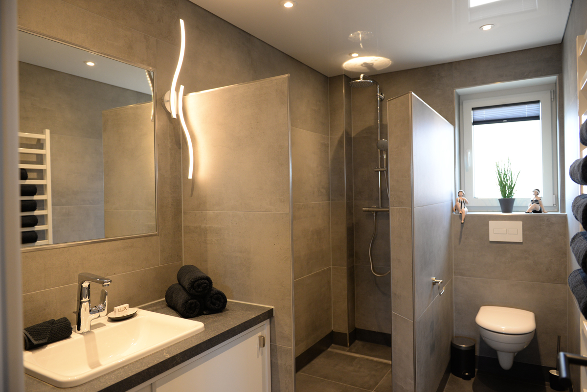 Das moderne Badezimmer mit Fenster verfügt über eine bodenebene Dusche, einem WC, eine Waschtischkombination mit großem Spiegel,Föhn usw.