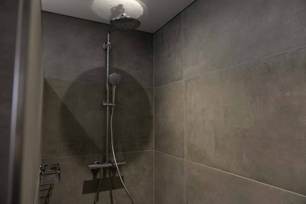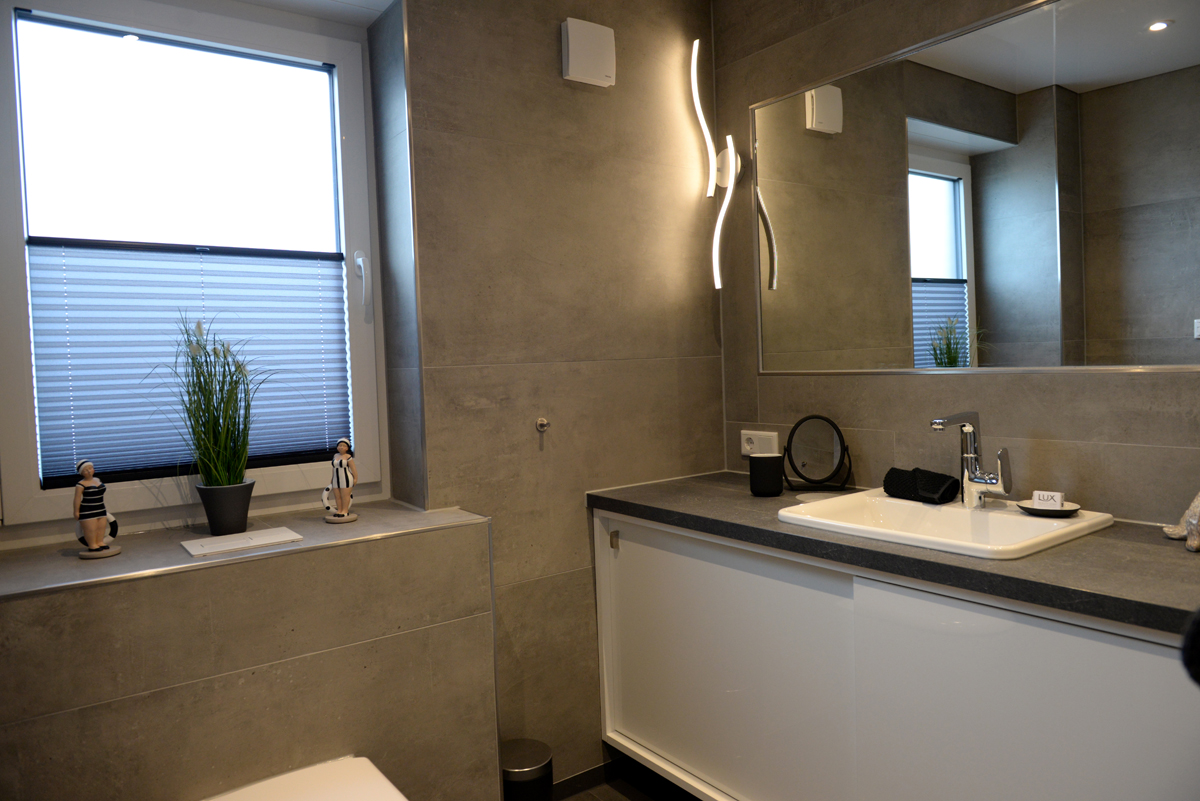 Das moderne Badezimmer mit Fenster verfügt über eine bodenebene Dusche, einem WC, eine Waschtischkombination mit großem Spiegel,Föhn usw.