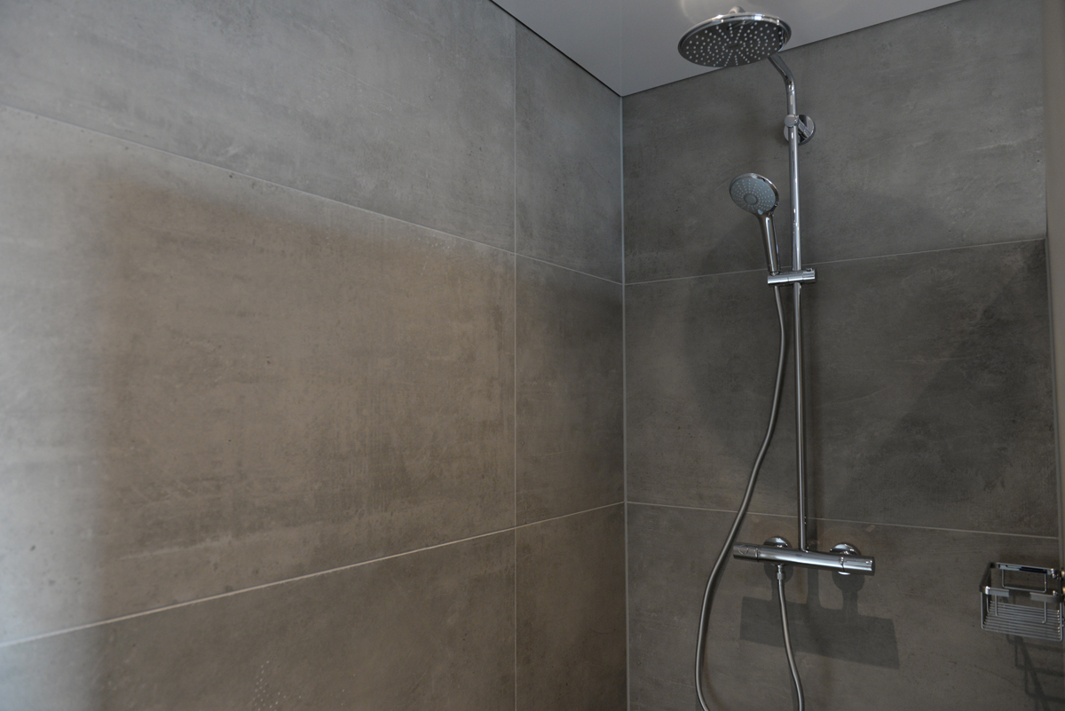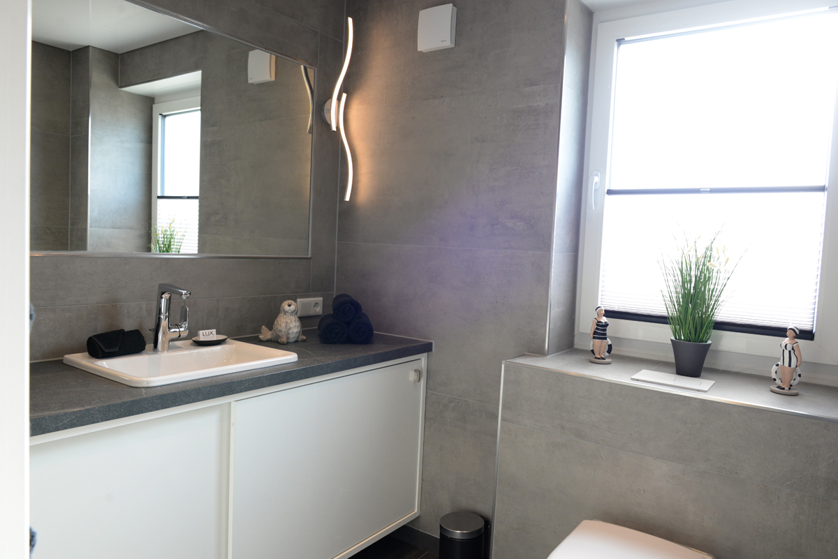 Das moderne Badezimmer mit Fenster verfügt über eine bodenebene Dusche, einem WC, eine Waschtischkombination mit großem Spiegel,Föhn usw.