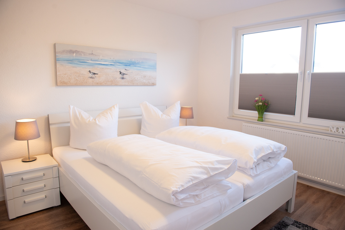 Die Wohnung besitzt ein Schlafzimmer, welches mit einem Doppelbett, Fernseher Sat/TV und Verdunklungsplissees + Außenjalousien ausgestattet ist.