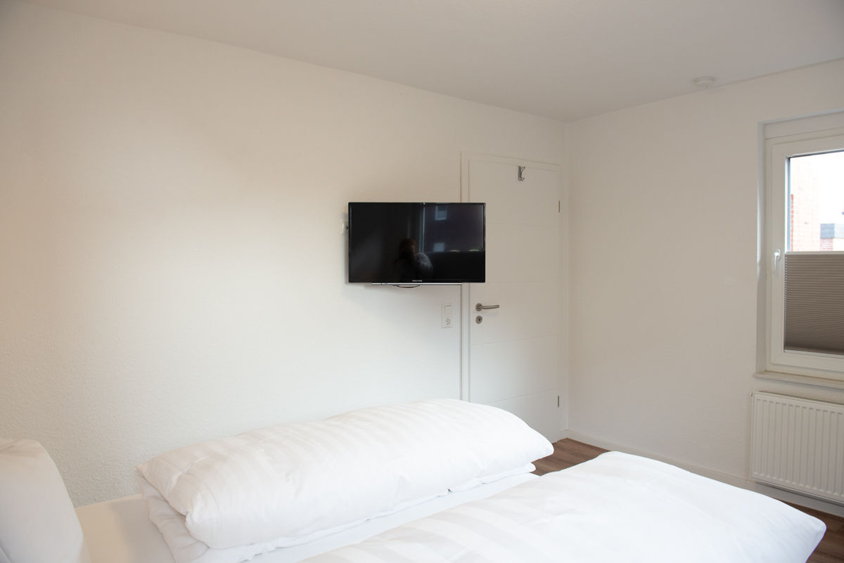 Die Wohnung besitzt ein Schlafzimmer, welches mit einem Doppelbett, Fernseher Sat/TV und Verdunklungsplissees und Außenrolladen ausgestattet ist.