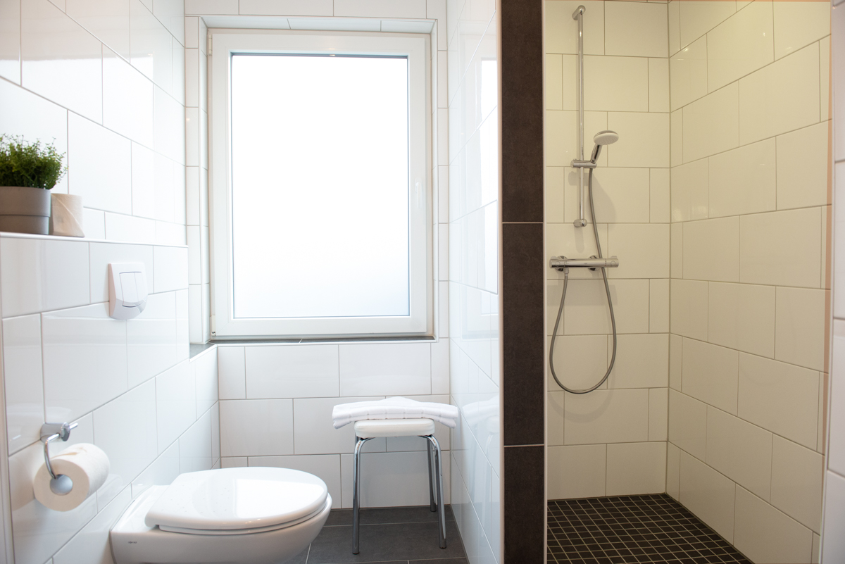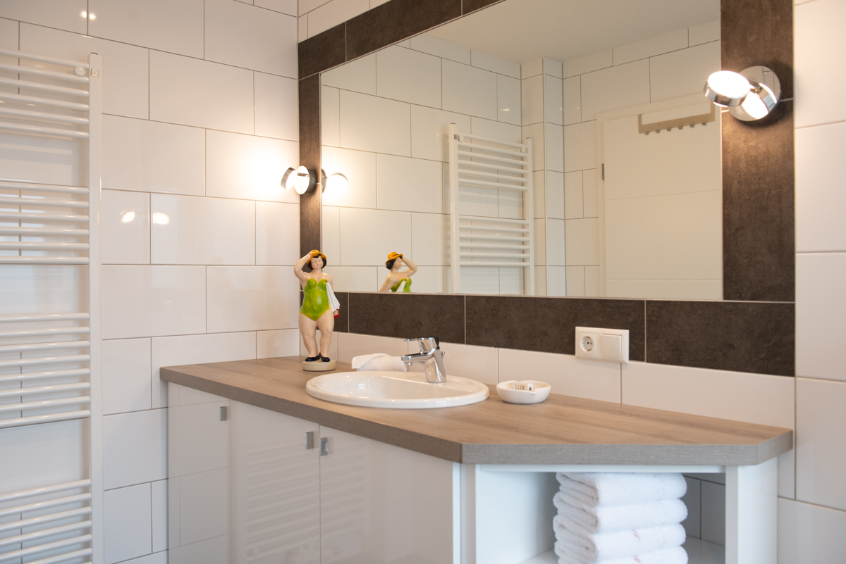 Das moderne Bad/ WC ist mit einer bodenebenen Dusche und einem Einbau -Waschtisch mit großem Spiegel ausgestattet.