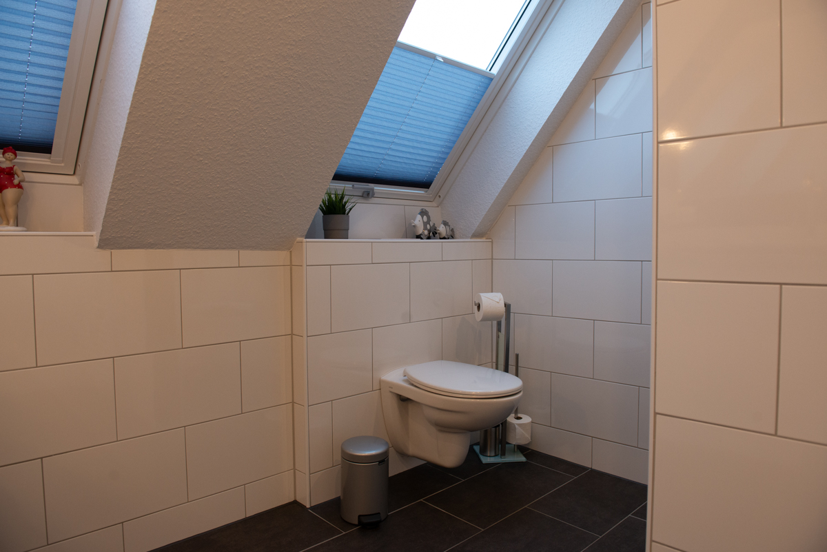 Das moderne Badezimmer mit Veluxfenster verfügt über eine bodenebene Dusche, einem WC, eine Waschtischkombination mit großem Spiegel,Föhn usw.