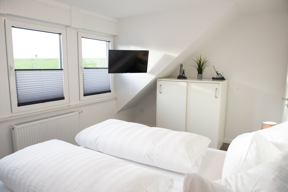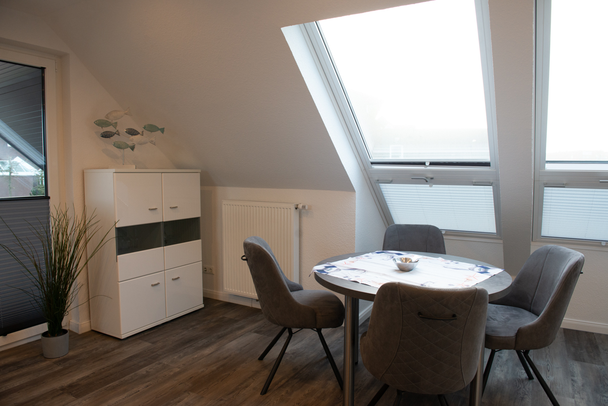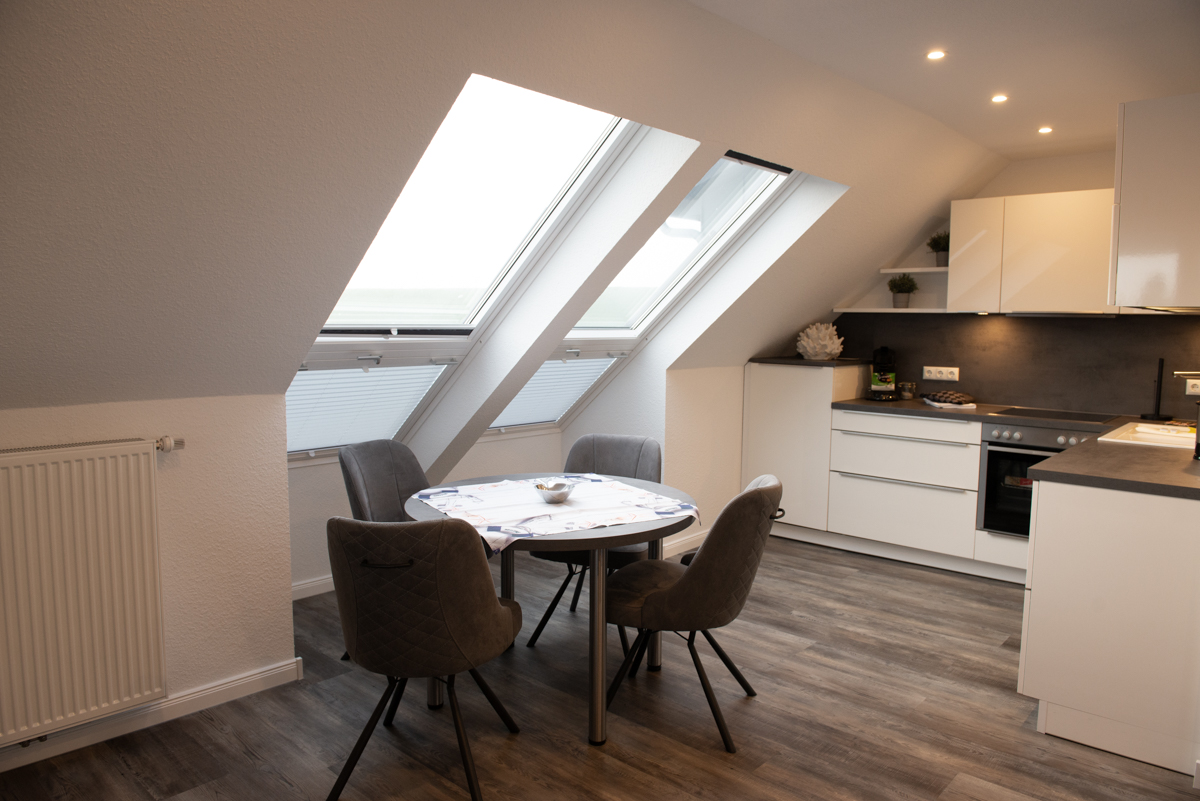 Die Ferienwohnung Deichhöhe HO für 2 Personen befindet sich im 1. OG eines neu erbauten Ferienhauses mit insgesamt 4 Ferienwohnungen in Norddeich. Die Wohnung liegt in einer Top-Lage mit Blick zum Deich. Das Wohn/Esszimmer ist mit einer gemütlichen Couch u. 2 Sessel, einem Flachbildschirm-Fernseher, einer Essgruppe und einer voll ausgestatteten Einbauküche eingerichtet.Von dort aus gelangen Sie auf eine überdachte Dachlounge und können den Sonnenuntergang geniesen, zusätzlich bieten 2 große Panorama-Veluxfenster einen direkten Blick auf den Deich und die Promenade.