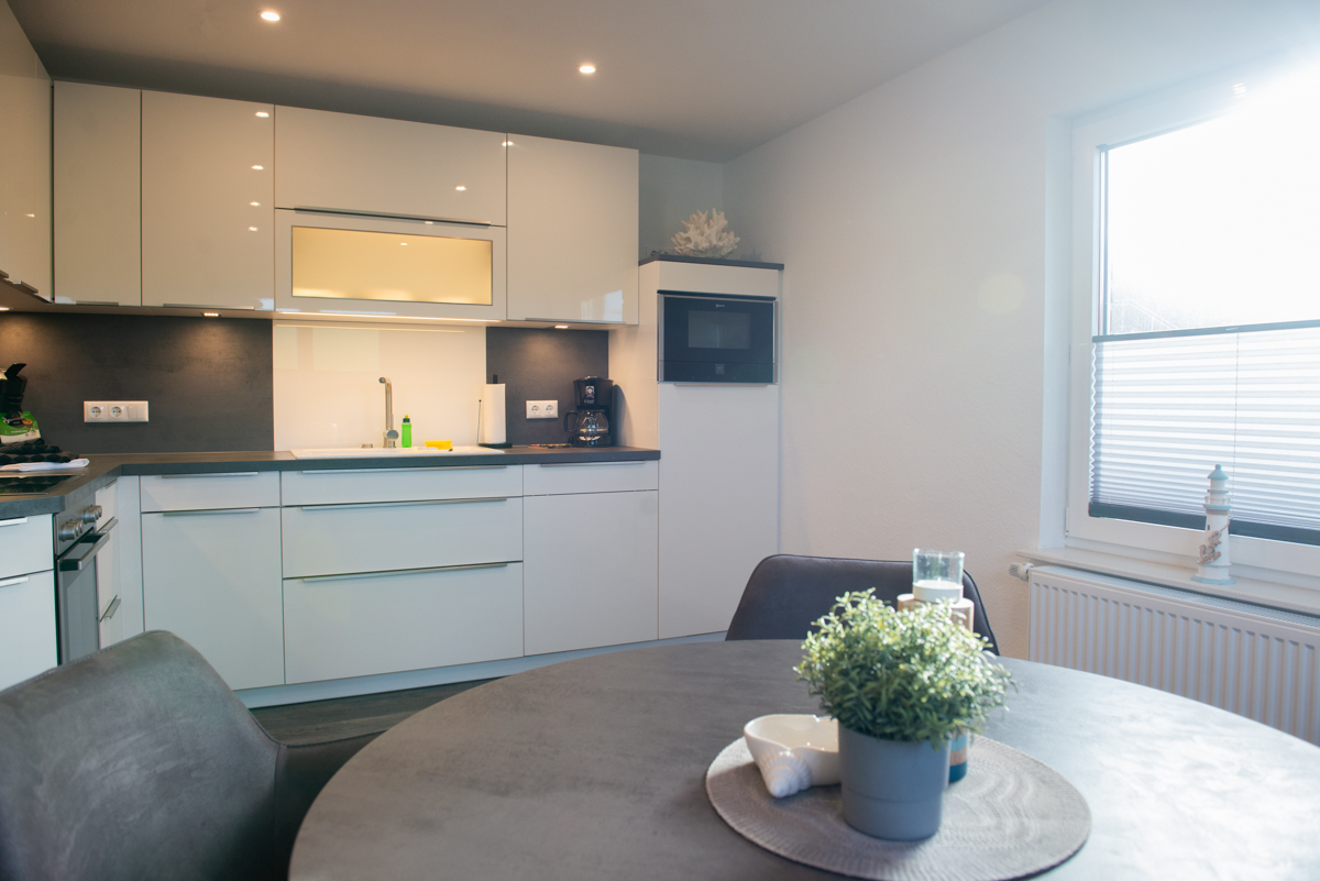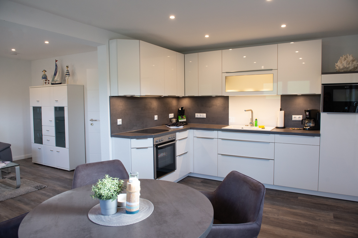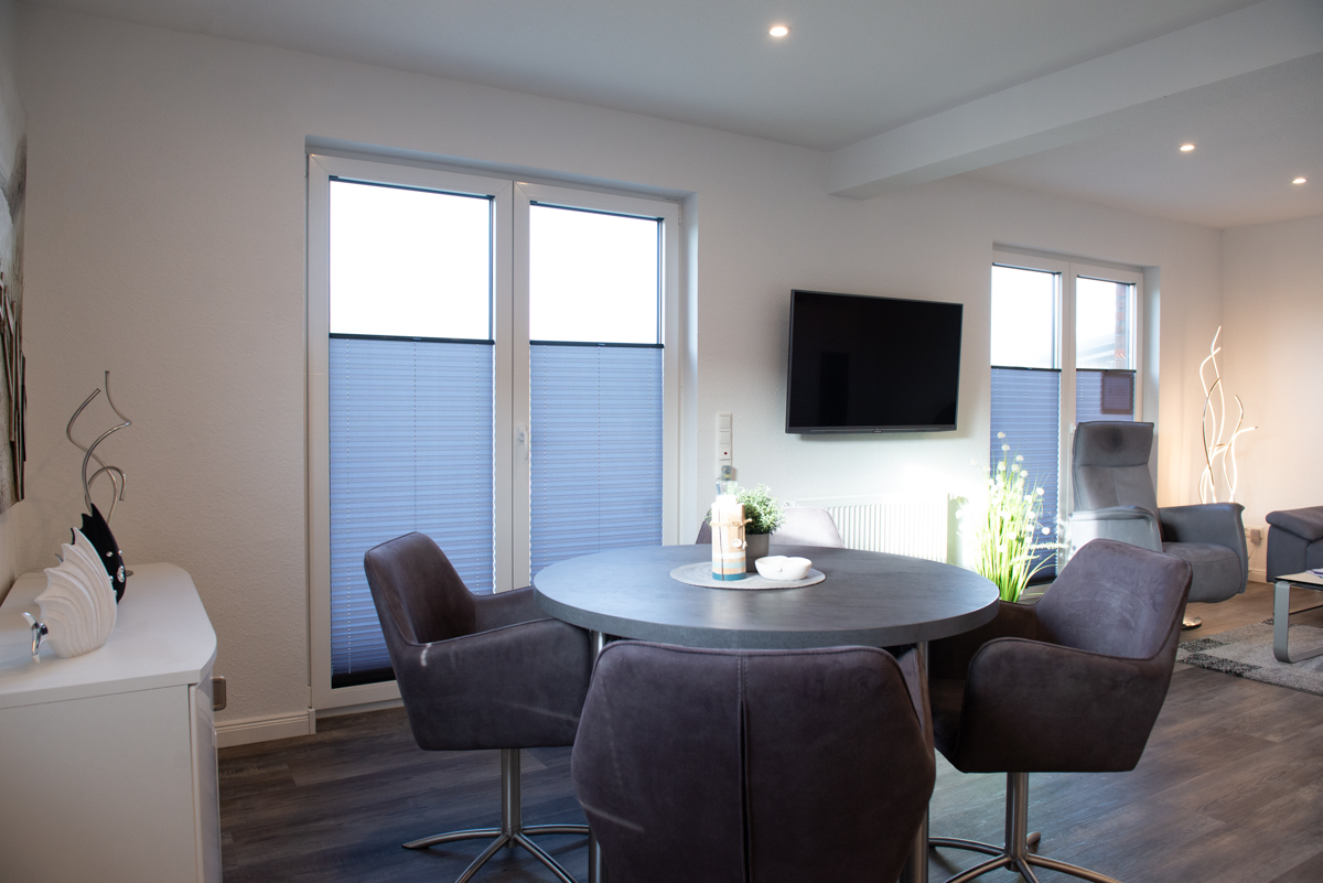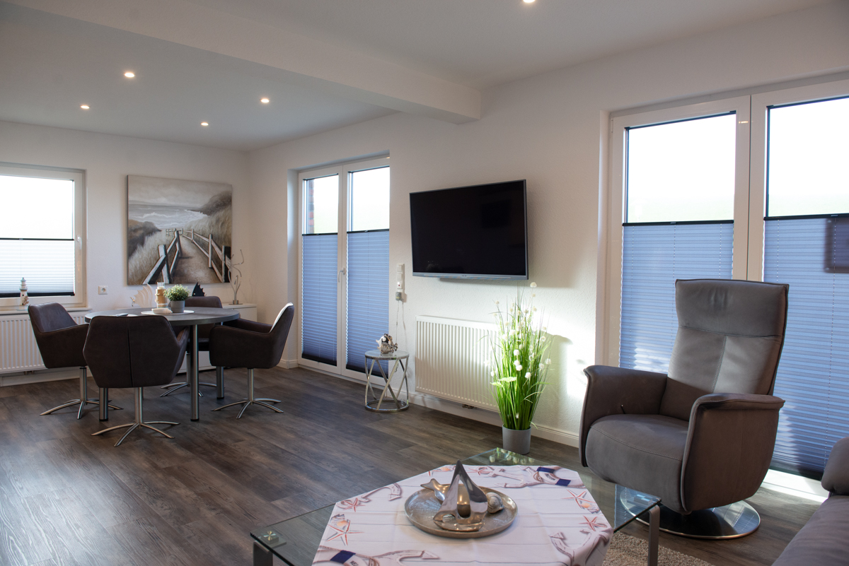Die Ferienwohnung Deichhöhe VU für 2 Personen befindet sich im Erdgeschoß eines neu erbauten Ferienhauses mit insgesamt 4 Ferienwohnungen in Norddeich. Die Wohnung liegt in einer Top-Lage mit direkten Blick zum Deich. Das Wohn/Esszimmer ist mit einer gemütlichen Couch , einem Relaxsessel, einem Flachbildschirm-Fernseher, einer Essgruppe und einer voll ausgestatteten Einbauküche eingerichtet. Von dort aus gelangen Sie auf eine möblierte Terrasse mit Deichblick und können den Sonnenuntergang geniesen.