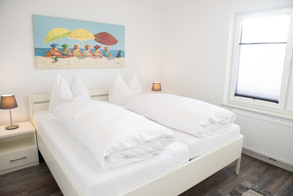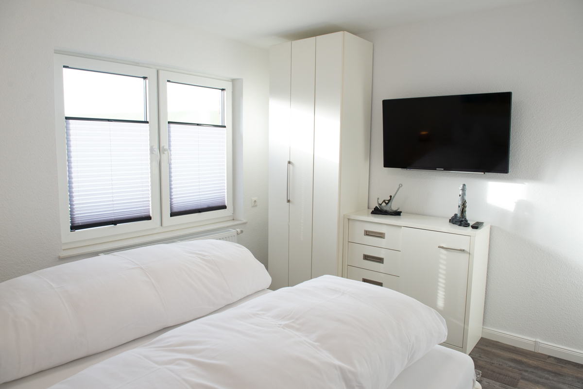 Das Schlafzimmer ist mit einem Doppelbett, Sat/TV, Verdunklungsplissees ausgestattet.