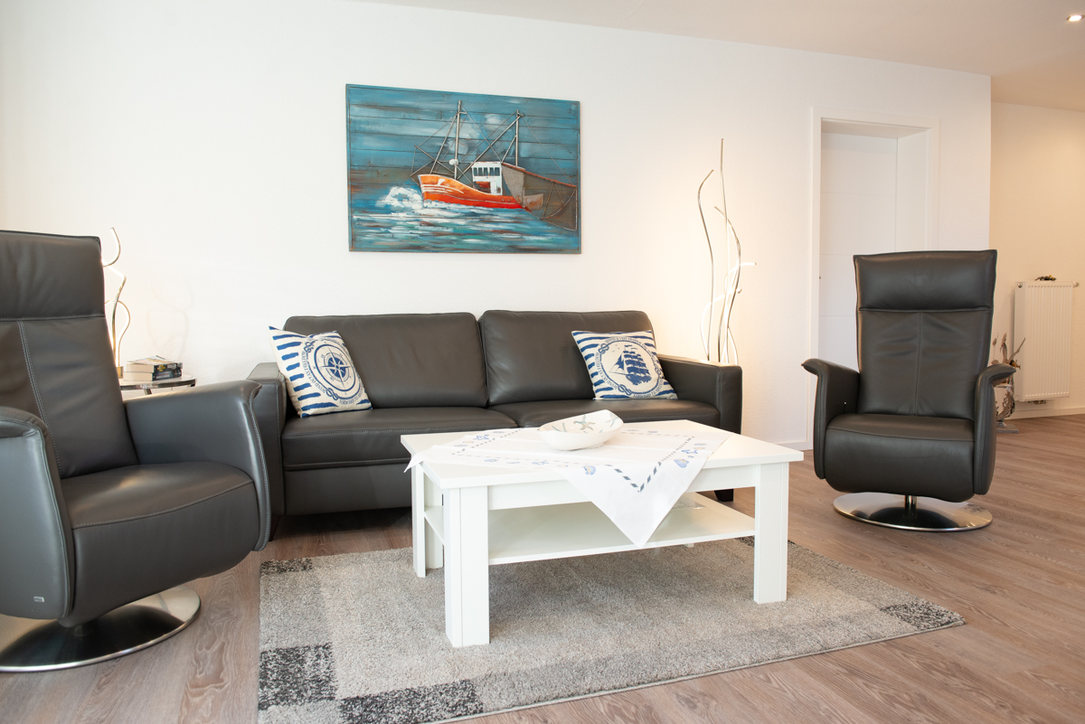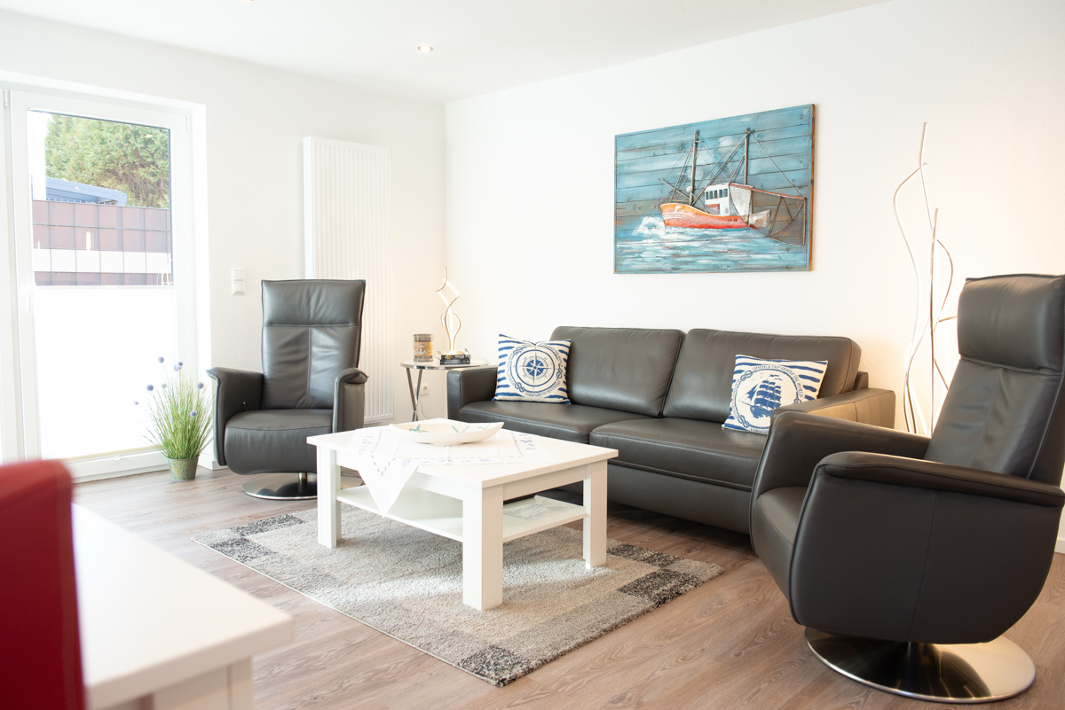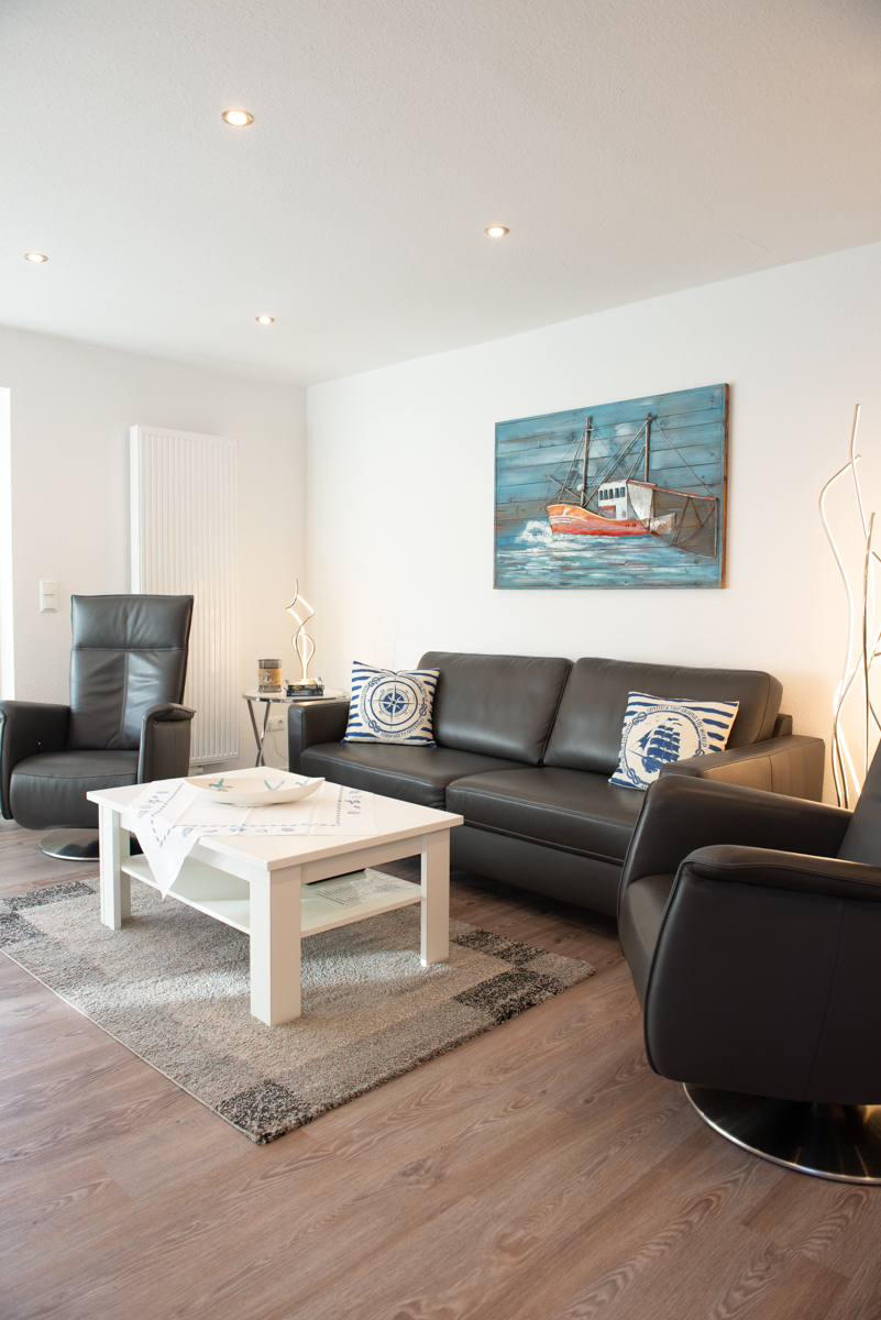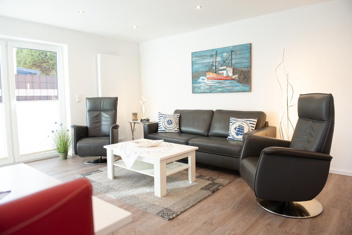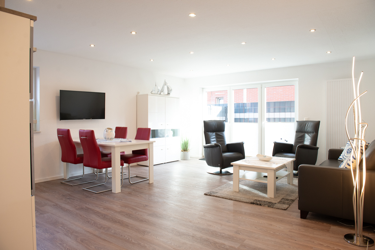 Die Ferienwohnung Deichnähe G liegt im Erdgeschoss,durch die große, moderne Diele mit Garderobe und heller Beleuchtung gelangen Sie in das Wohn/Esszimmer, das mit einer gemütlichen Couch und 2 Relaxsessel, einer kompletten Essgruppe und einer voll ausgestatteten Einbauküche eingerichtet ist. Von dort aus erreichen Sie die eingezäunte Terrasse mit gemütlichen Gartenstühlen.