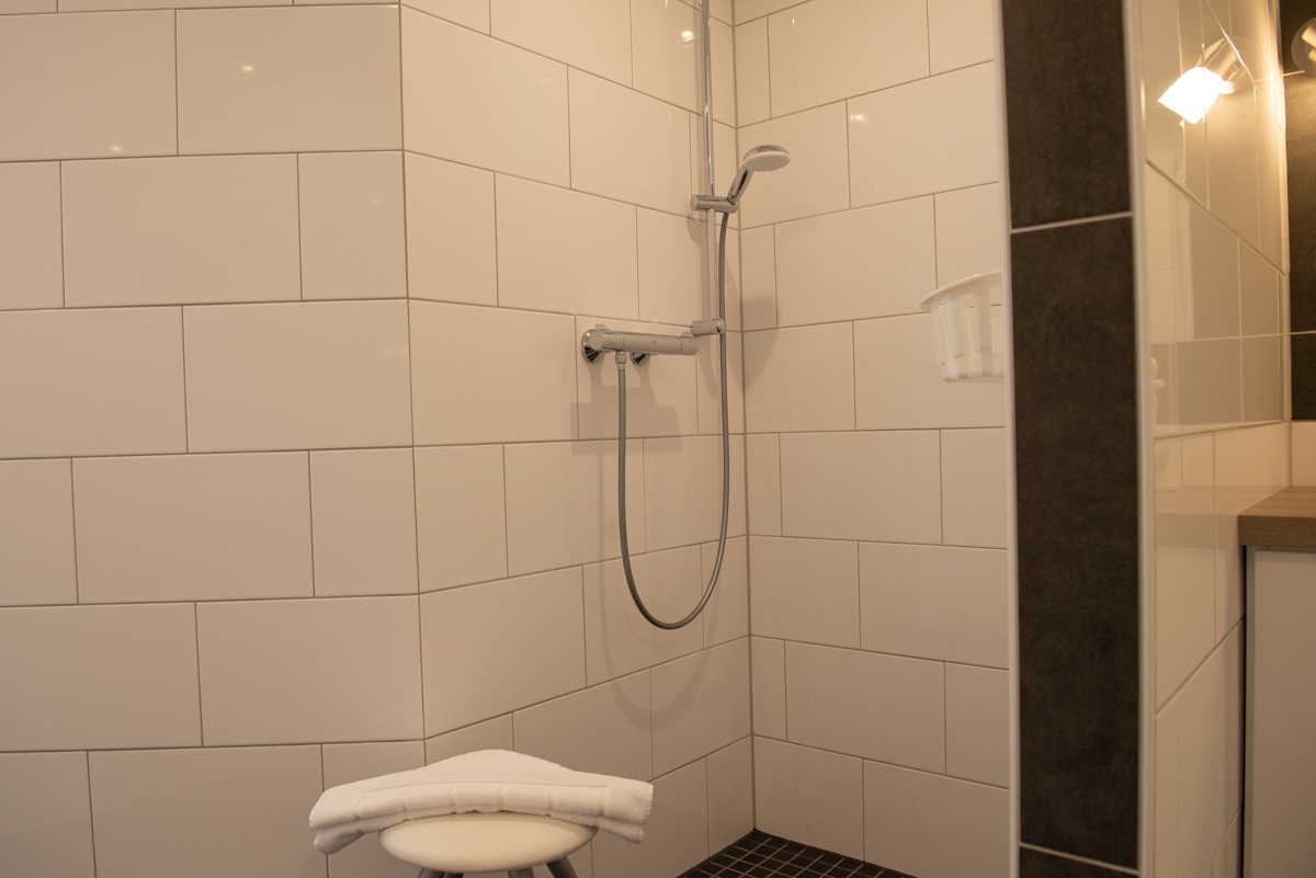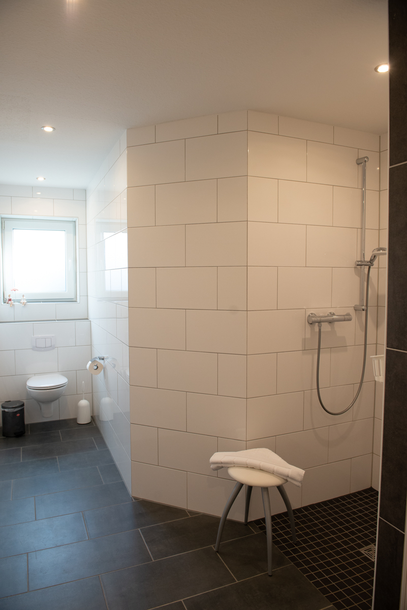 Das moderne große Bad/WC mit Fenster verfügt über eine bodenebene Dusche, WC, Waschtischkombination,Föhn, Hocker, Kosmetikspiegel u.v.m.
