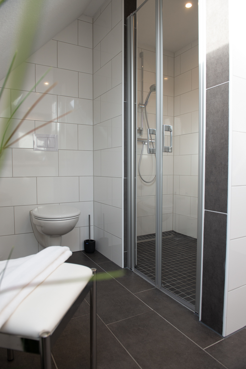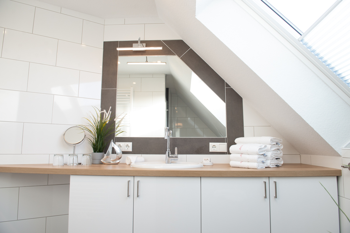 Das moderene Bad/WC hat eine bodenebene Dusche, eine Waschtischanlage mit großen Spiegel, ein großes Veluxfenster mit Deichblick.