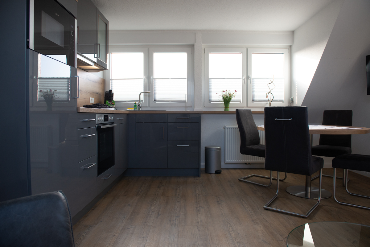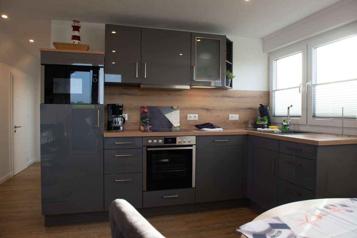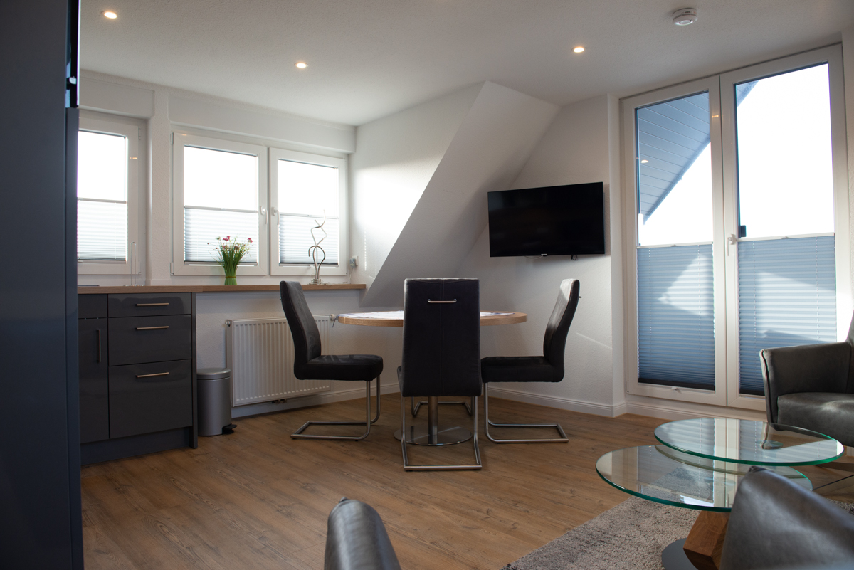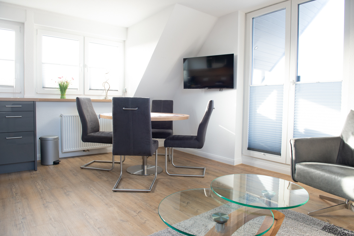 Im Wohn - Essbereich ist eine integriete - voll ausgestattete Küche, eine Essgruppe, ein Flachbildschirm Sat/TV, eine gemütliche Couch und 2 Sessel vorhanden. Von dort aus gelangen Sie auf eine überdachte Dachlounge mit Deichblick und können den Sonnenuntergang geniesen.
