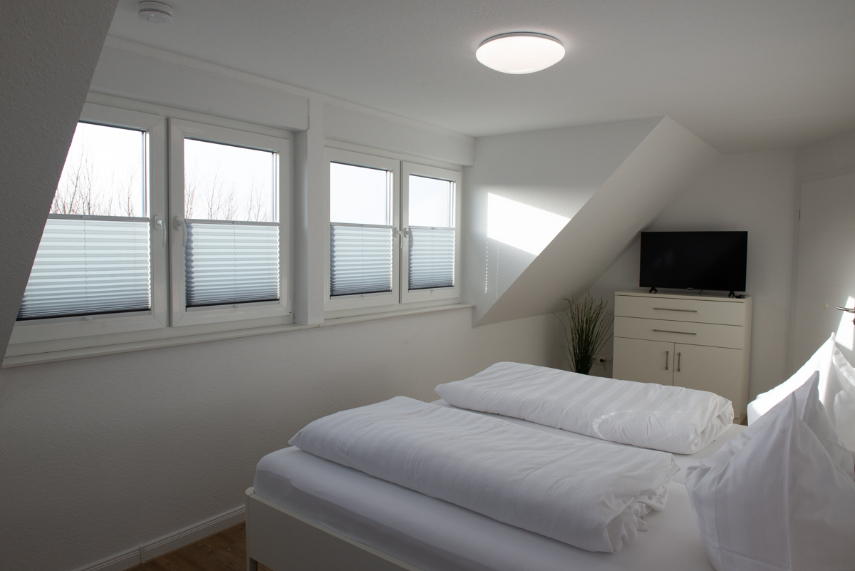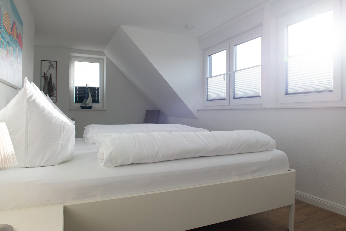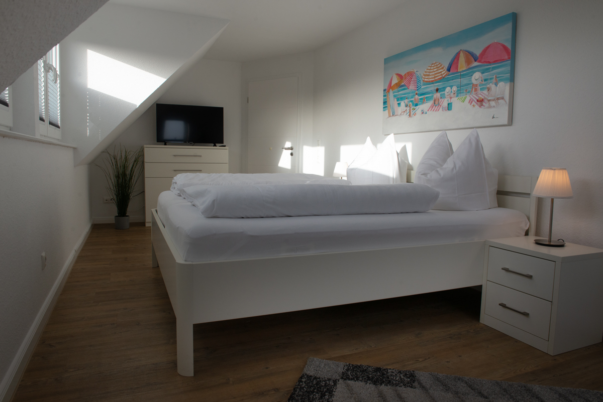 Das Schlafzimmer ist mit einem Doppelbett, einen Flachbildschirm Sat/TV, Außenrolläden + Verdunklungsplissees ausgestattet.