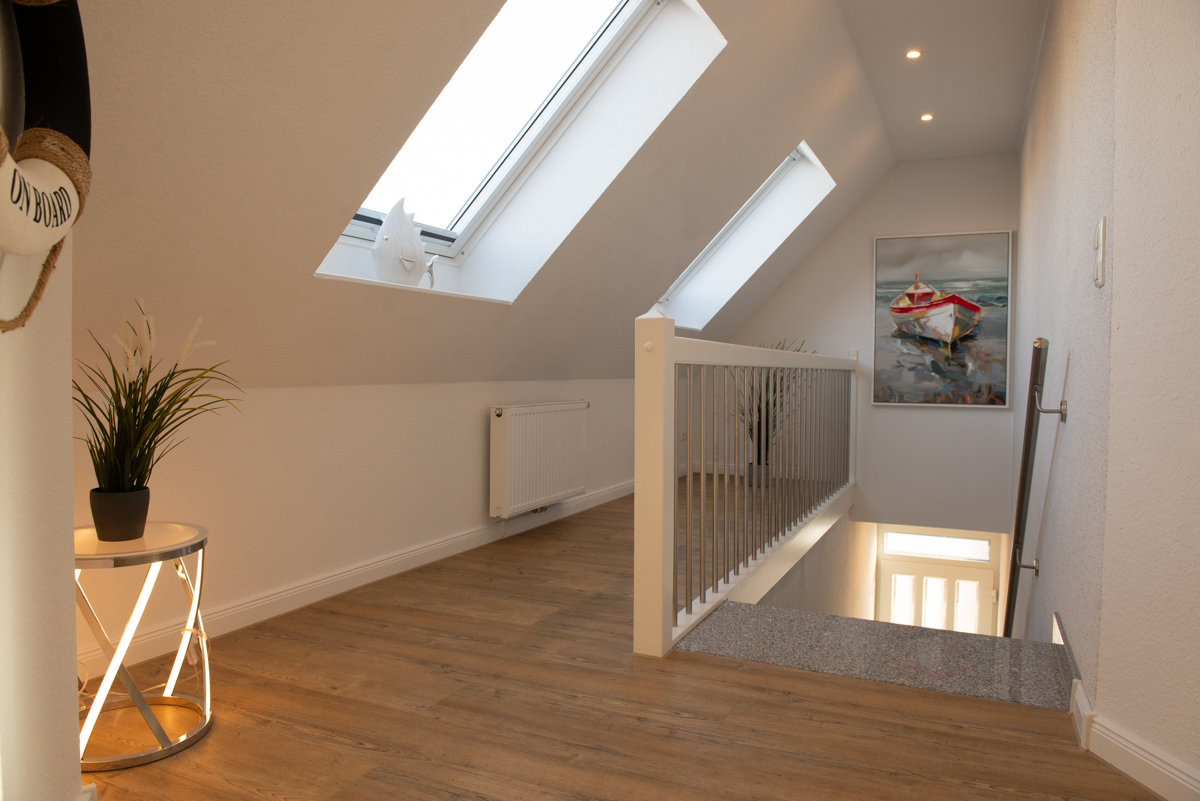 Die Ferienwohnung Deichstübchen oben hat einen getrennten Hauseingang, liegt im ersten Obergeschoß und hat eine erstklassige Aussicht zum Deich.