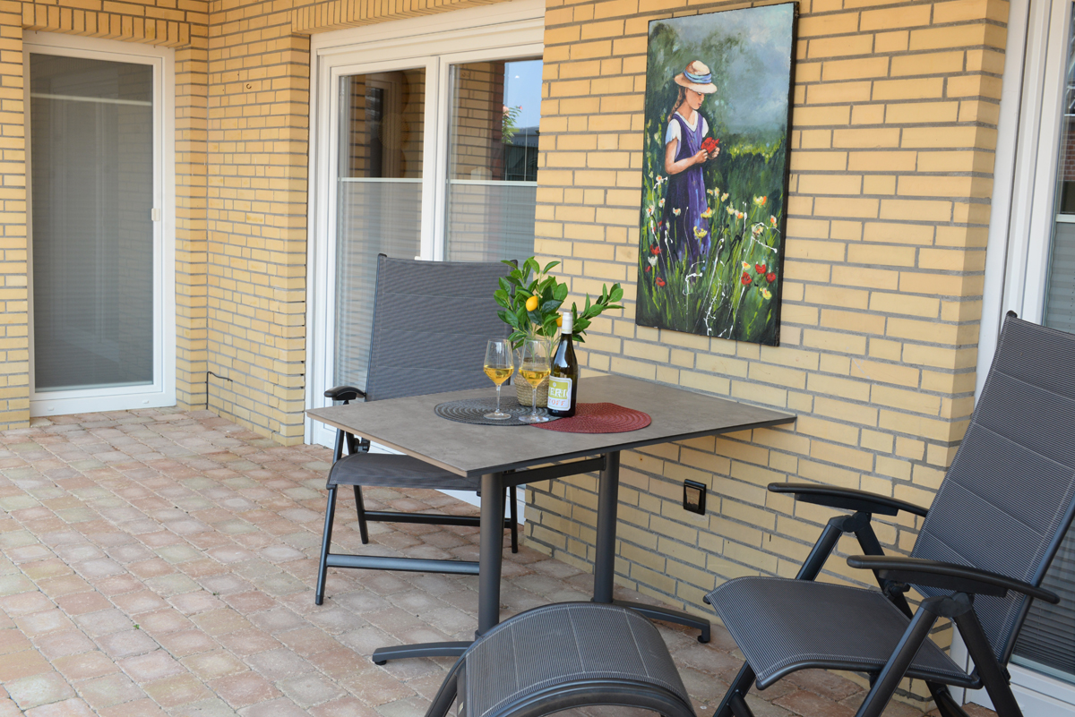 Im Wohn - Essbereich ist eine integriete - voll ausgestattete Küche, eine Essgruppe, ein Flachbildschirm Sat/TV, eine gemütliche Couch mit 2 Relaxsessel ist vorhanden. Von dort aus gelangen Sie auf die möblierte Terrasse - die zum Sonnenbaden und Relaxen einlädt..