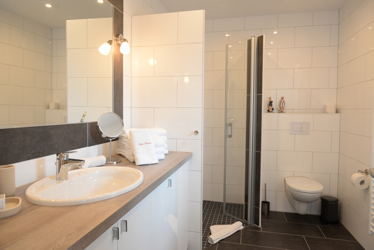 Das moderene großzügige Bad/WC hat eine bodenebene Dusche, ein Fenster und eine Waschtischanlage mit großen Spiegel.