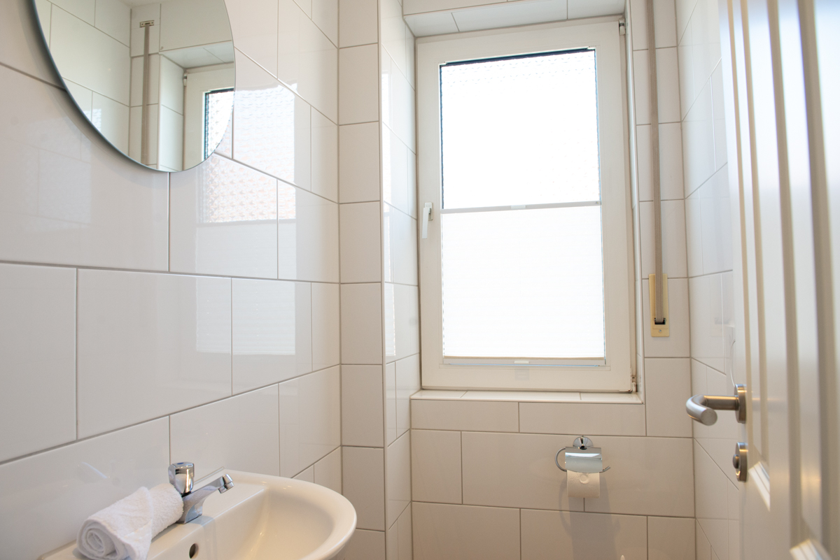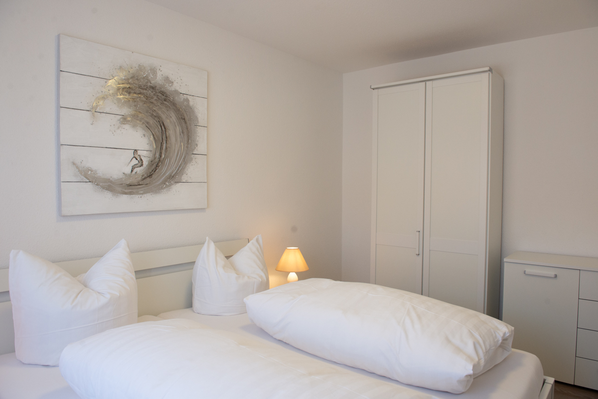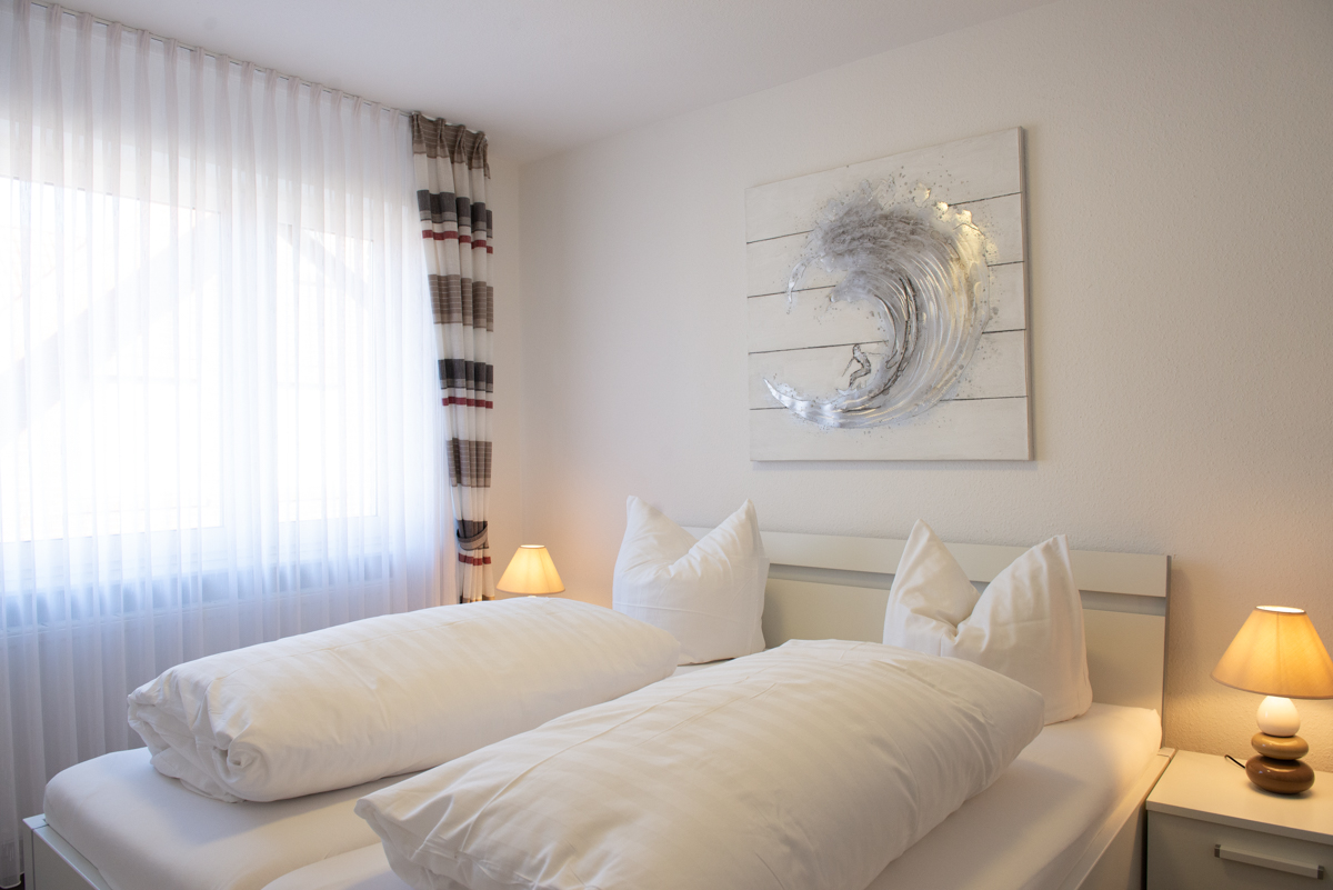 Die Ferienwohnung Florence liegt im 1.OG und verfügt über zwei getrennte Schlafzimmer mit Außenrolläden, davon ist ein Schlafzimmer mit einem TV-Sat Flachbildschirm ausgestattet. Das WC ist separat. Das moderne Bad ist mit einem Fenster, einer bodenebenen Dusche und einem Handtuchhalter - Heizungskörper ausgestattet.