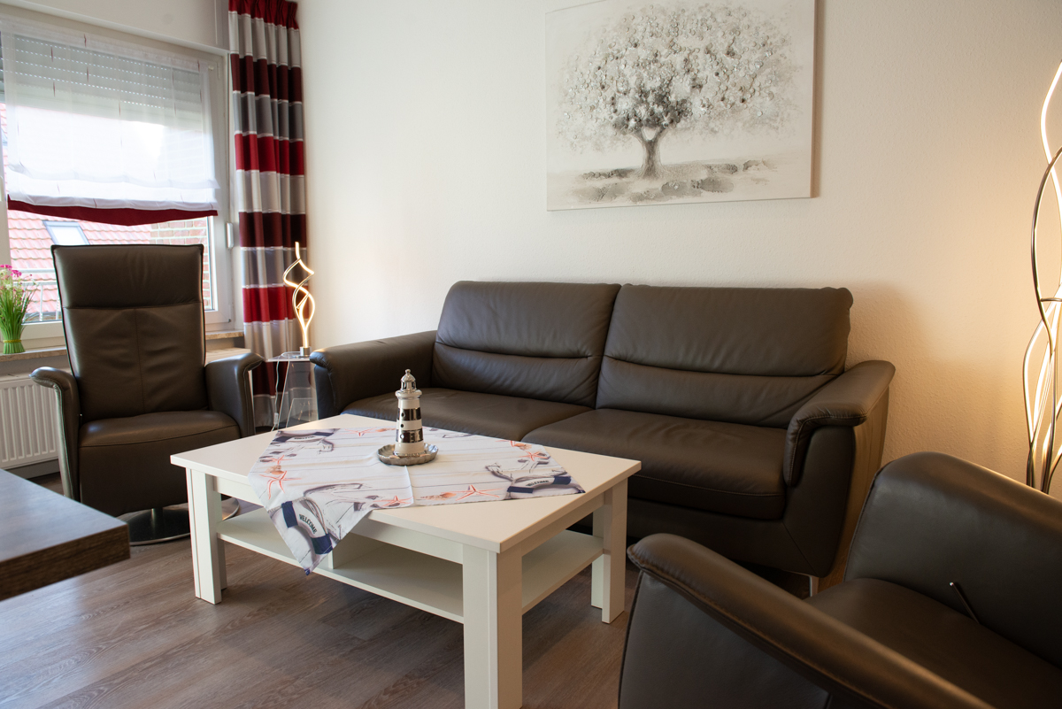 Im Wohn - Essbereich mit Tisch und 4 Stühlen sowie einer gemütlichen Couch, zwei Relax-Sessel und Sat/TV mit Flachbildschirm können Sie entspannt relaxen und der Balkon lädt zum Sonnenbaden ein. Die Küche ist getrennt vom Wohnbereich und hält alle Kochutensilien für Sie bereit.