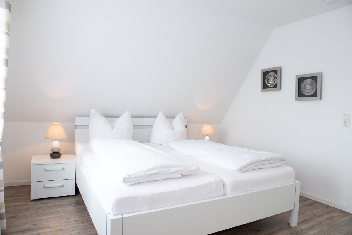 Im 1. Obergeschoß befinden sich zwei Schlafzimmer, das erste Schlafzimmer mit Doppelbett, Außenrolläden und einem Fernseher. Das 2. Schlafzimmer mit einem Einzelbett und Veluxfenster - sowie ein Bad mit Dusche und ein separates WC.
