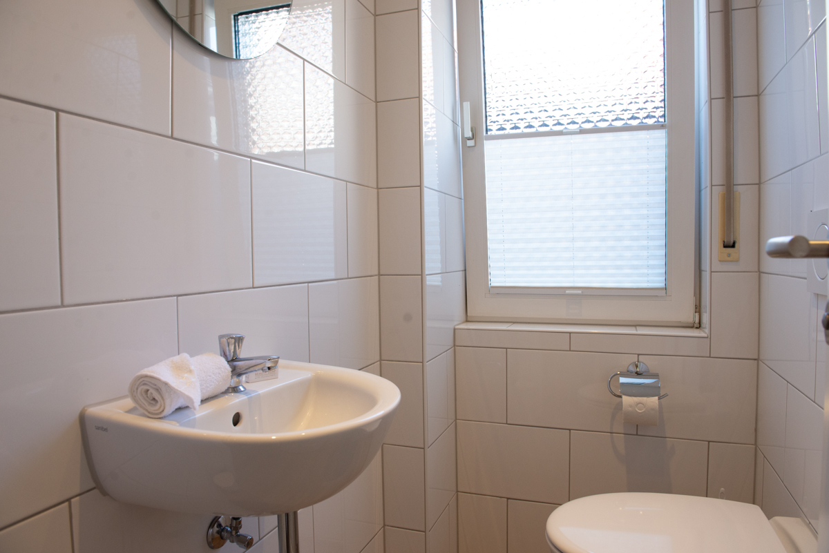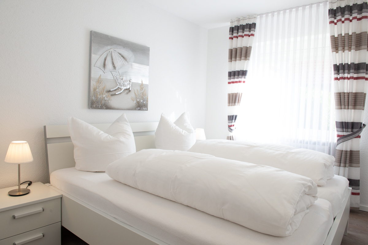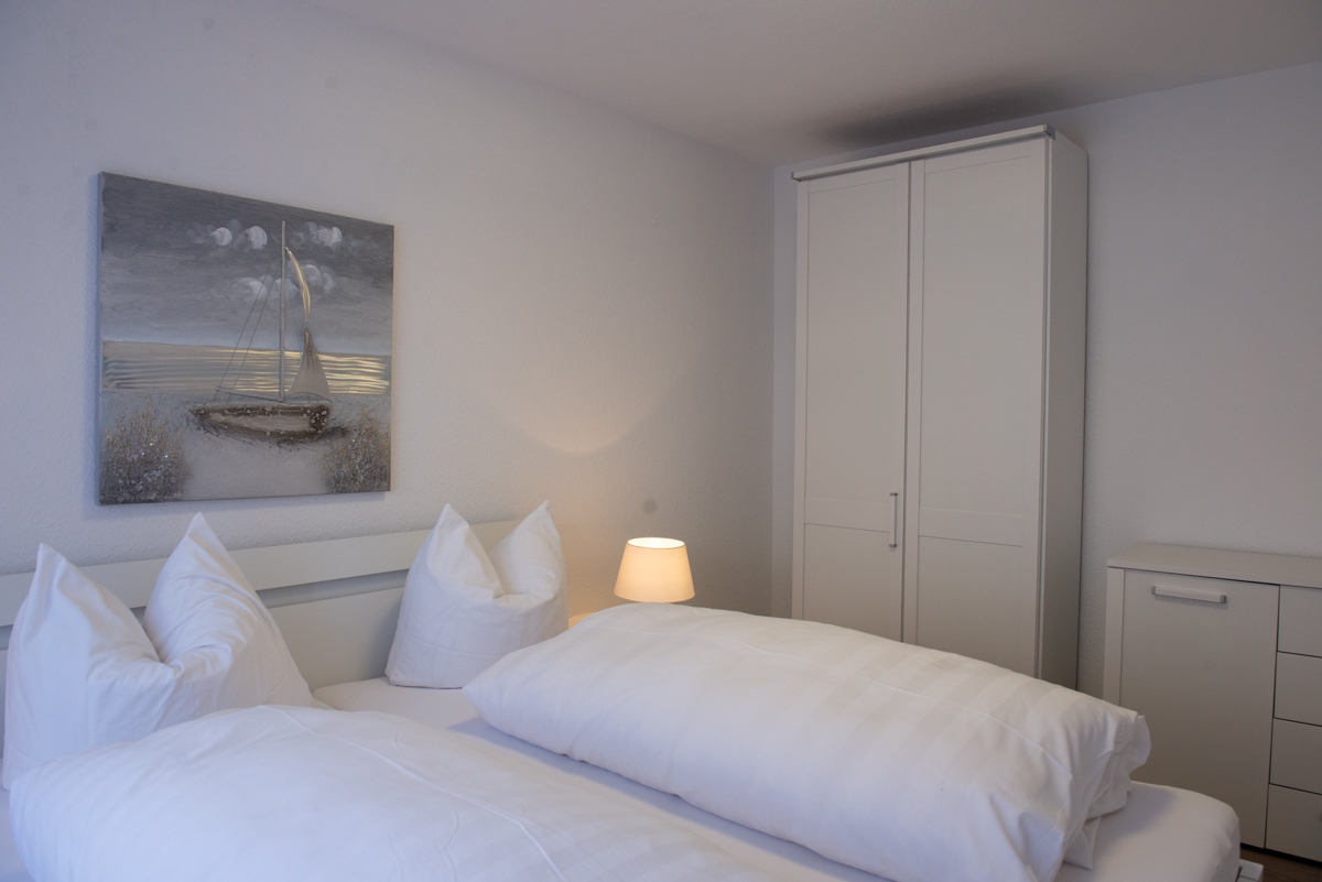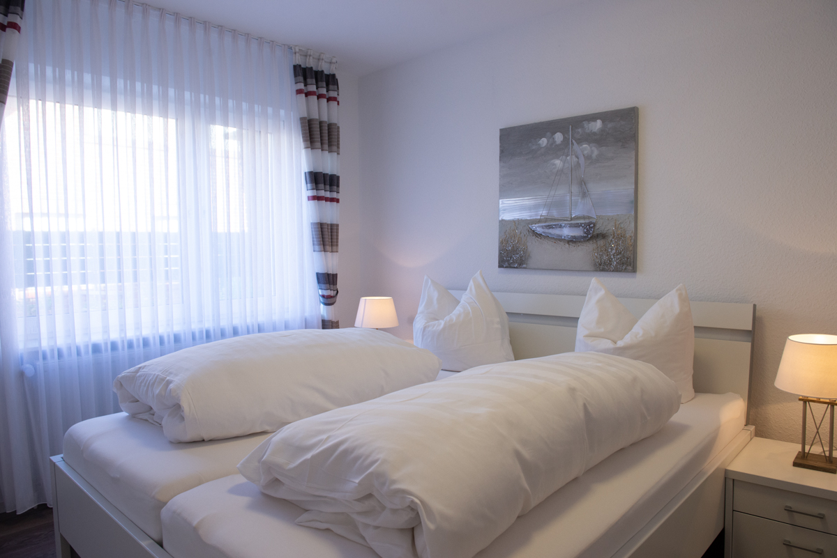 Die Ferienwohnung Olivia liegt im Erdgeschoss und verfügt über zwei getrennte Schlafzimmer mit Außenrolläden, davon ist ein Schlafzimmer mit einem TV-Sat Flachbildschirm ausgestattet. Das WC ist separat. Das moderne Bad ist mit einem Fenster, einer bodenebenen Dusche und einem Handtuchhalter - Heizungskörper ausgestattet.