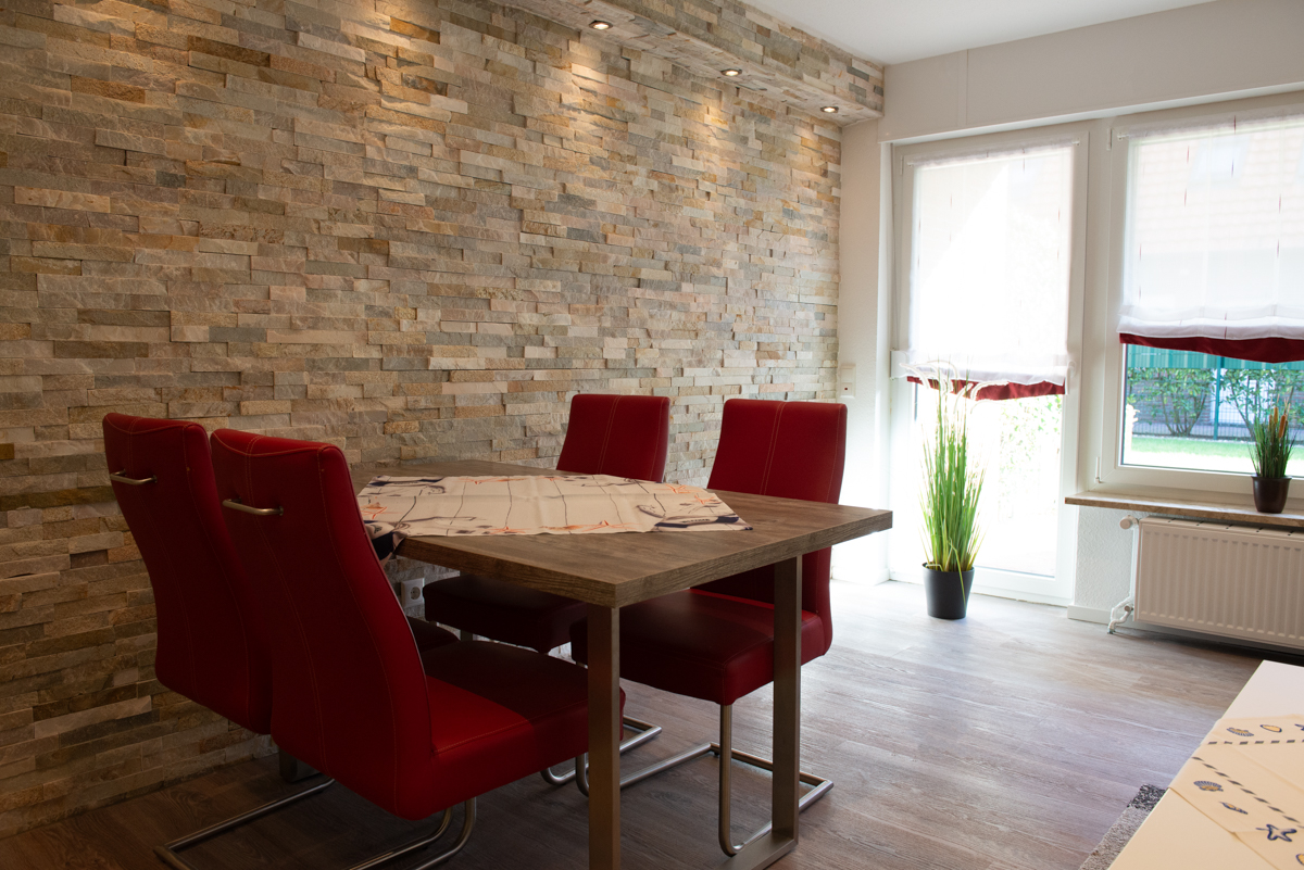 Im Wohn - Essbereich mit Tisch und 4 Stühlen sowie einer gemütlichen Couch, zwei Relax-Sessel und Sat/TV mit Flachbildschirm können Sie entspannt relaxen, von dort aus gelangen Sie zur teilweise überdachten Terrasse mit einer kleinen Rasenfläche. Die Küche ist getrennt vom Wohnbereich und hält alle Kochutensilien für Sie bereit.