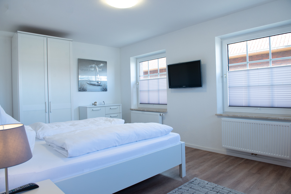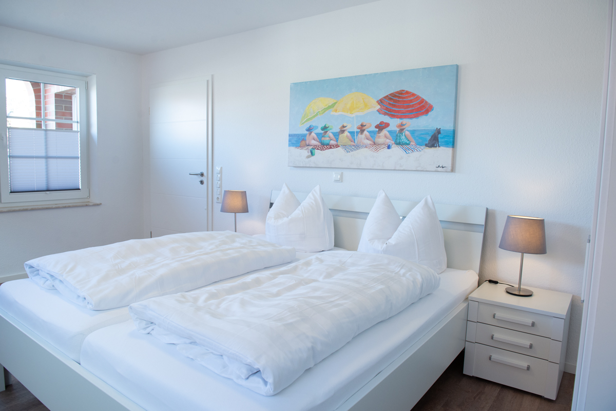 Das Schlafzimmer besitzt Außenrolläden und ist mit einem Doppelbett, verstellbaren Lattenrahmen und guten Matratzen ausgestattet.