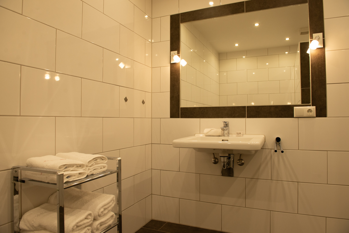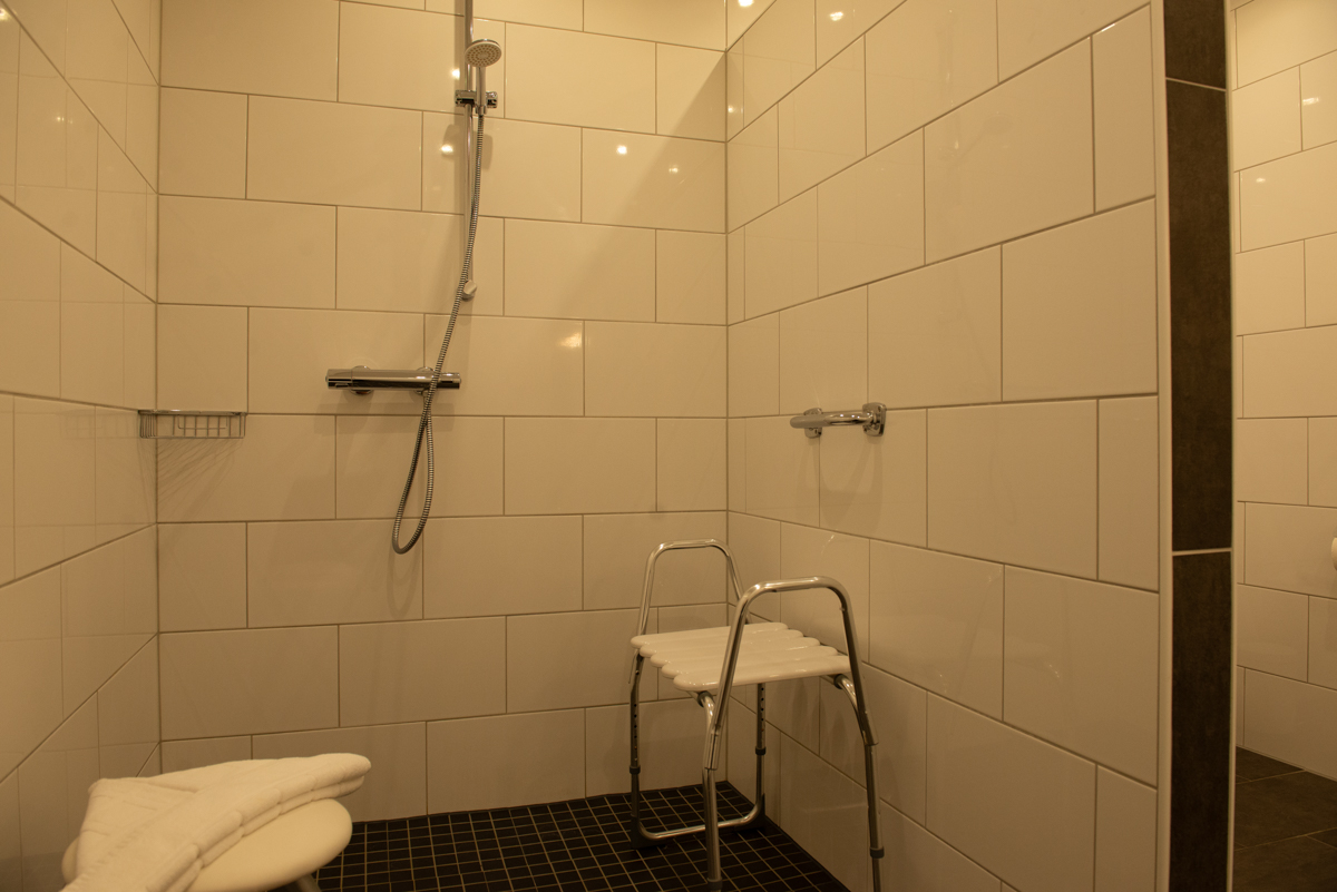 Das große Bad/WC ist mit einer bodenebenen Dusche ausgestattet.