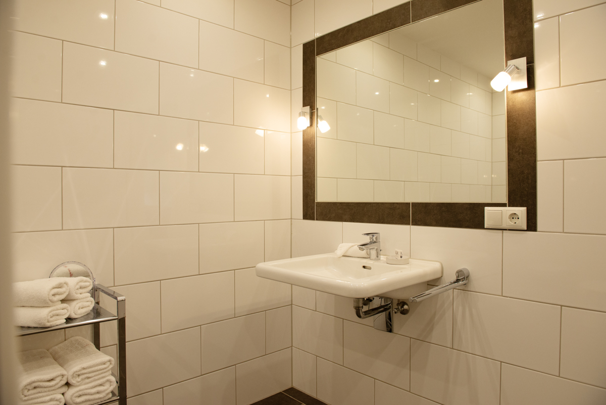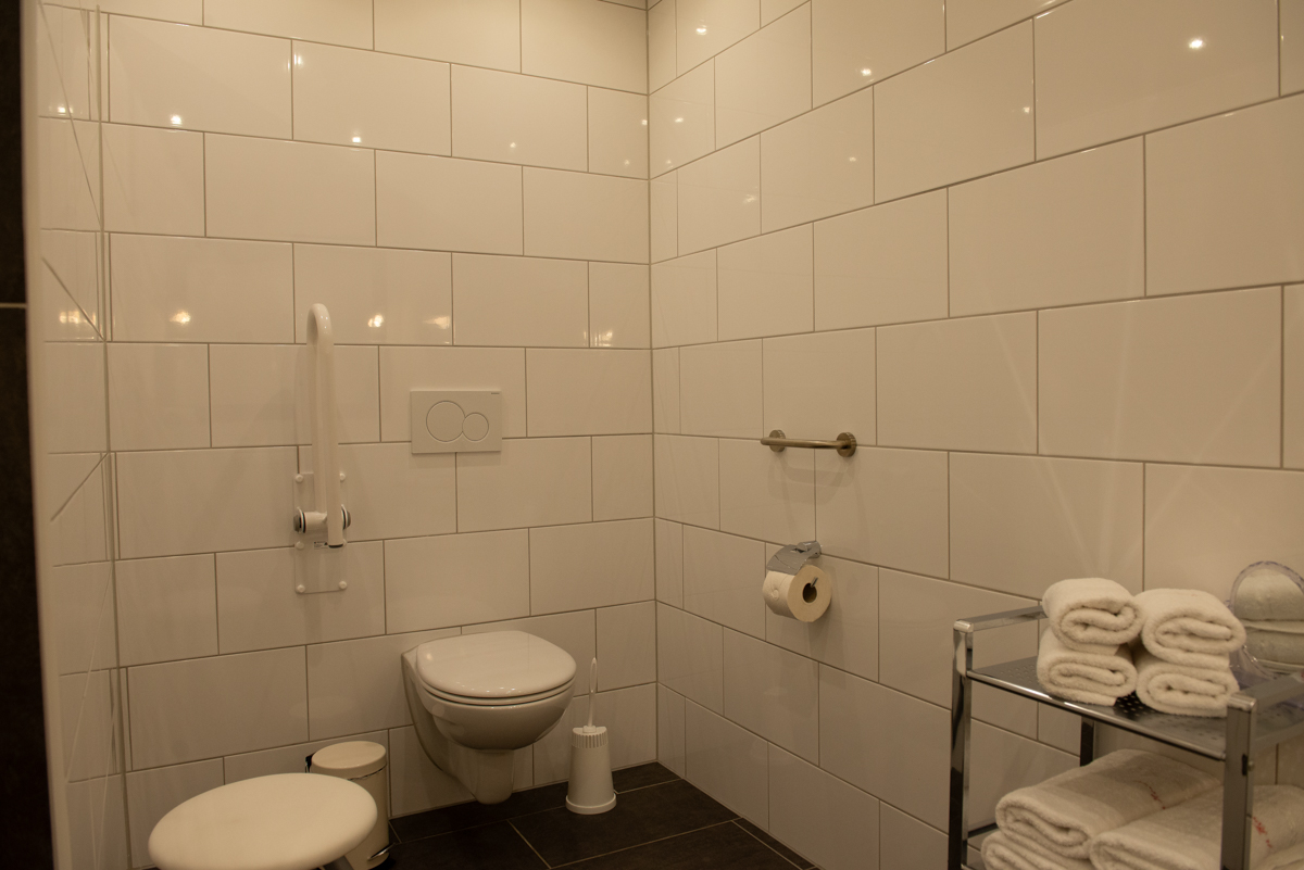 Das große Bad/WC ist mit einer bodenebenen Dusche ausgestattet.