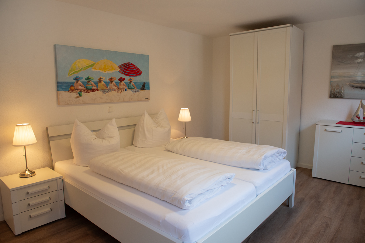 Das Schlafzimmer besitzt Außenrolläden und ist mit einem Doppelbett, verstellbaren Lattenrahmen und guten Matratzen ausgestattet.