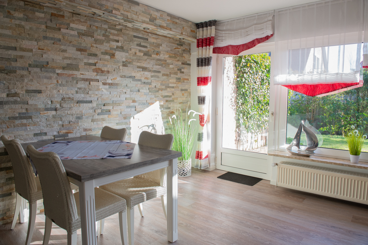 Im Wohn - Essbereich mit Tisch und 4 Stühlen sowie einer gemütlichen Couch, einem Sessel / Relax-Sessel und Sat-TV mit Flachbildschirm können Sie entspannt relaxen, Essen oder z.B. mit der Familie oder Freunden einen Spieleabend gestalten. Die getrennte, compl. eingerichtete Küche liegt ebenfalls im unteren Teil der Wohnung.