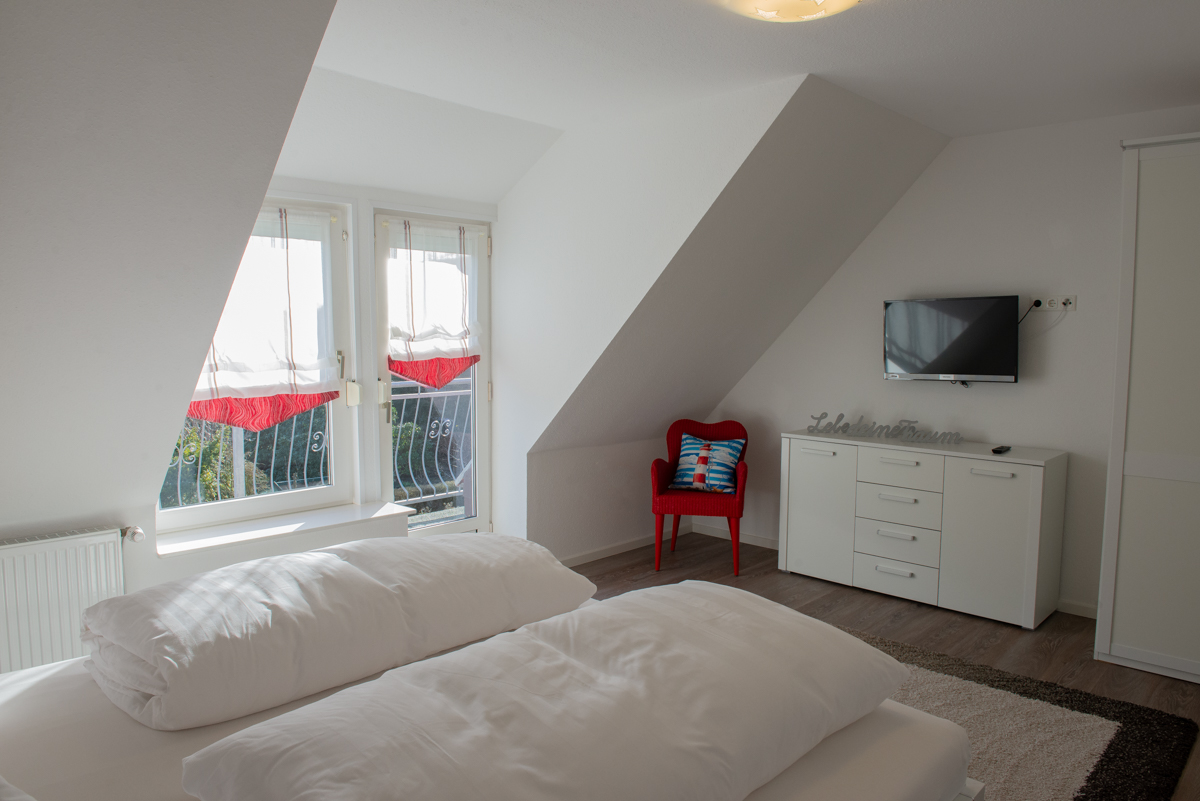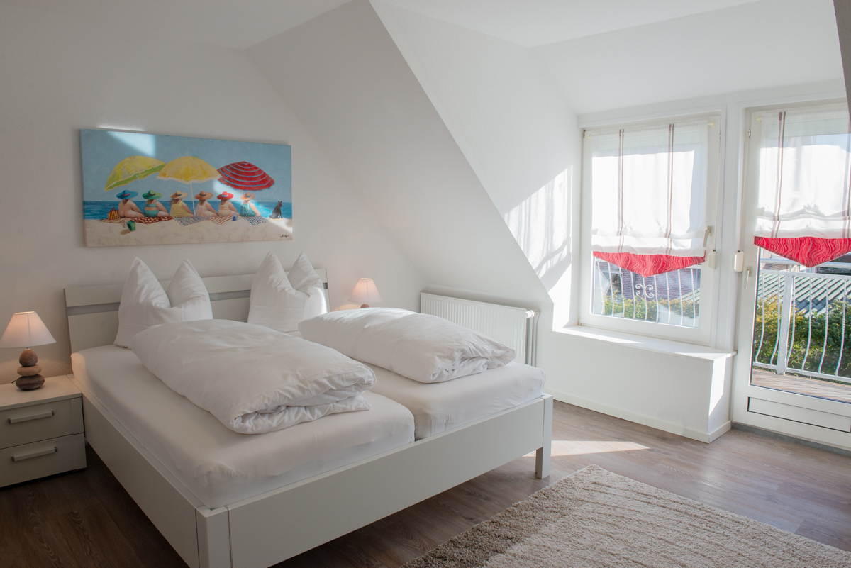 Die Ferienwohnung Stürbord verfügt über zwei getrennte Schlafzimmer im 1. OG ,davon ist ein Schlafzimmer mit Außenrolläden und SAT- TV ausgestattet .Außerdem befindet sich im 1. OG ein zusätzliches WC. Das moderne Bad / WC ist mit Fenster, einer bodenebenen Dusche und einem Handtuchhalter - Heizkörper ausgestattet.
